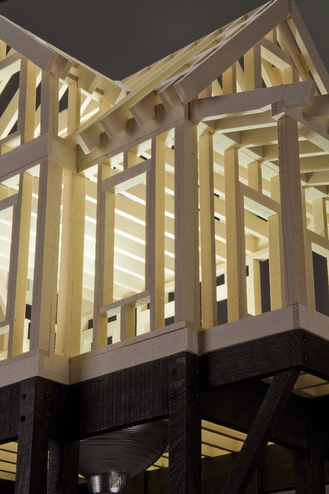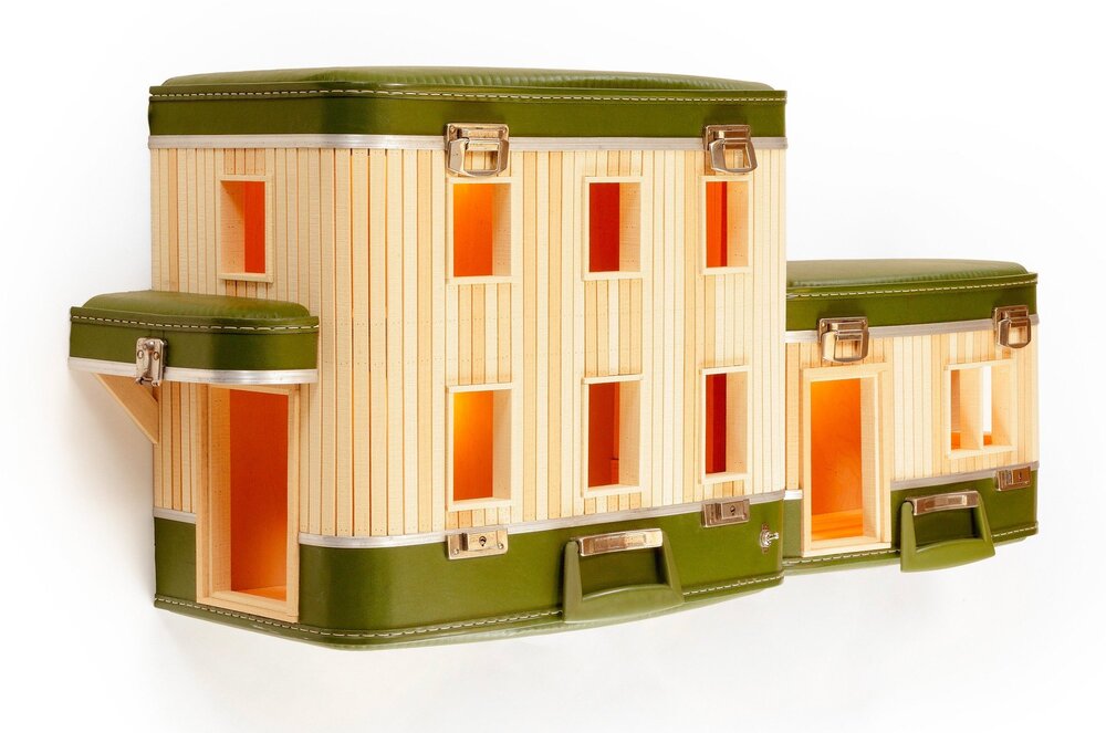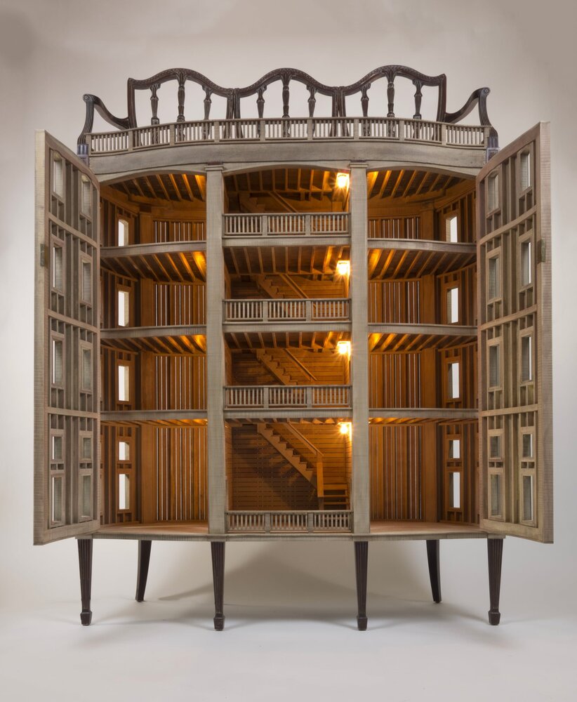 Ted Lott sandalyelerin yanı sıra eski koltuklara, dolaplara, taburelere, aydınlatma objelerine ve bavullara mimari model görünümü kazandırıyor. Sanatçı, insanlığın temel ihtiyaçlarından biri olan barınmaya odaklanarak endüstriyel devrimin etkisi altındaki farklı barınma yöntemlerini araştırıyor. Lott, dış cephe kaplamaları ve boya gibi dekoratif unsur dayatmalarını devreden çıkarıyor, küçük ölçekli modelleriyle modern mimarinin özüne iniyor. Bu mimari modelleri bol süslü klasik mobilyalarla inşa etmesi, çalışmalarına ilginç bir estetik kazandırıyor. Modellerin içine ışık ekleyerek içlerinde yaşayan biri varmış hissi yaratıyor. Lott, buluntu mobilyaları şerit testereyle keserek parçalarına ayırıyor.