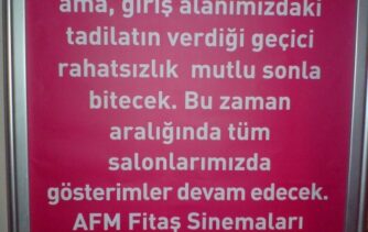 Taksim’deki AFM Fitaş sinemaları klasik ‘Çevreye verdiğimiz geçici rahatsızlıktan dolayı özür dileriz!’ temalı mesajını bakın nasıl güzel bir dille avantaja