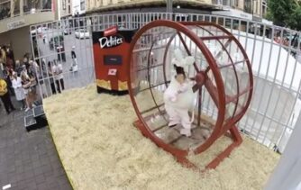 Fantastic Delites markası için yapılan etkinlikte fare kılığında bir çark içinde koşmanız gerekiyor.