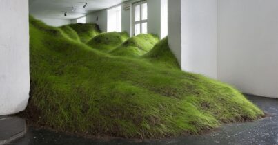Galerinin boş alanlarını kaplayan çimenler, bizi doğadan nasıl koptuğumuz üzerine düşünmeye yönlendiriyor.