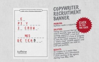 Kaffeine ajansı, reklam yazarı banner ilanını bir anagram bilmece şeklinde oluşturmuş. Üşenmeyip anagramı çözenler bunun bir yazar ilanı olduğunu anladıkları