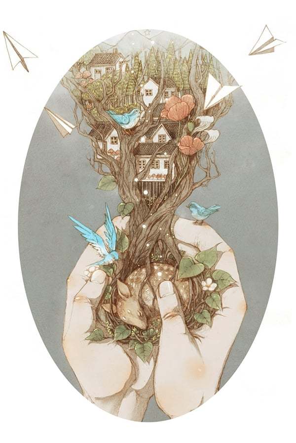 Çinli illüstratör Jin Xingye, Green adlı illüstrasyon serisinde insan ve doğa arasındaki kopmuş bağları birleştiriyor.