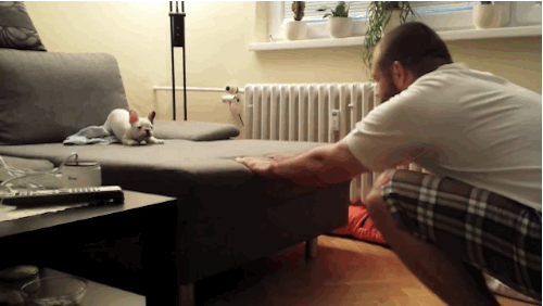 French Bulldog yavrusu, tereddüt etmeden güvendiği insanın kucağına atlıyor.