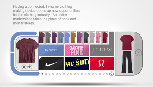 Jashua Harris’in yarattığı 3 boyutlu baskı yazıcısı sayesinde herkes evinde kendi kıyafetini kendi üretiyor. Buraya kadar olan kısmı biliyoruz, yakın gelecekte bu gerçekten olacak. Daha detaylı bilgi için bu işi şimdiden hayata geçiren ve internet satışı yapan uygulamaların sahiplerinden birinci ağızdan dinlemek için SXSW haberimizi okuyabilirsiniz. Harris’in konsepti de kargo bedelinden, ziyan olan kıyafetlerden kurtarmak üzerine kurulu. Bu konseptte evinizdeki cihazdan markaların internet mağazalarından alışveriş yapıyorsunuz ve giysiyi evinizdeki yazıcıdan basıyorsunuz.
