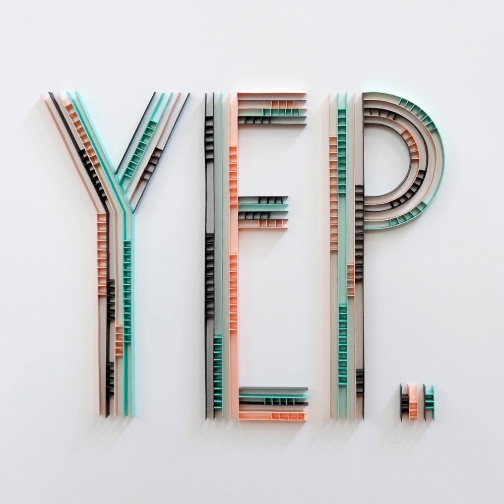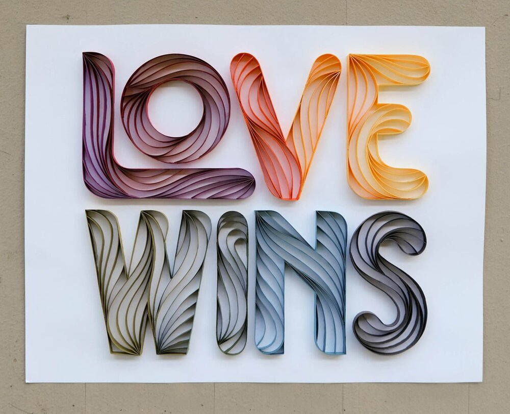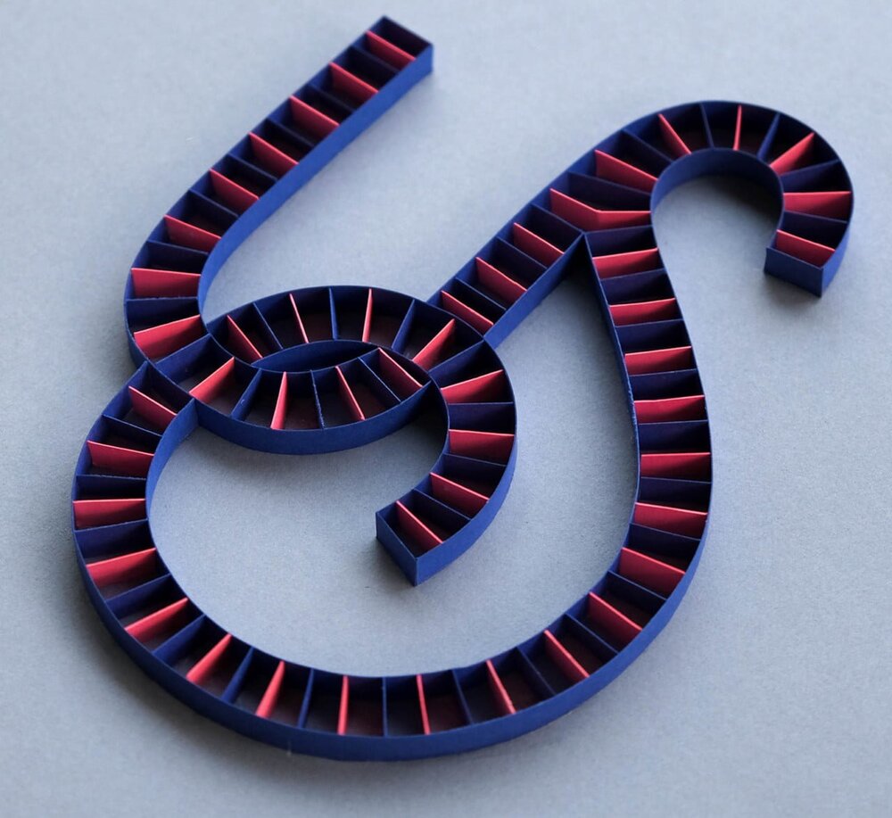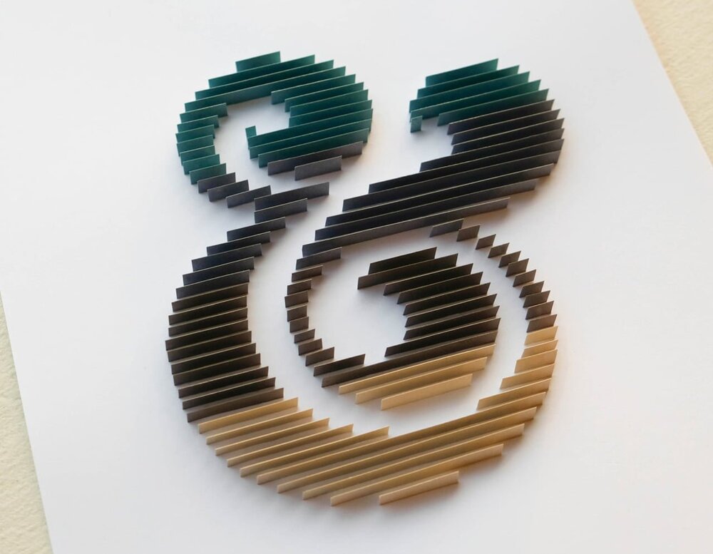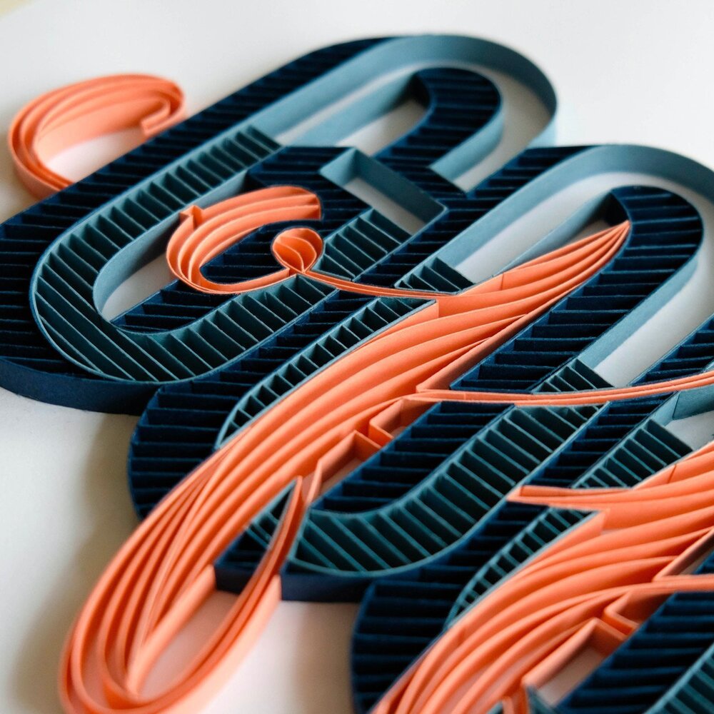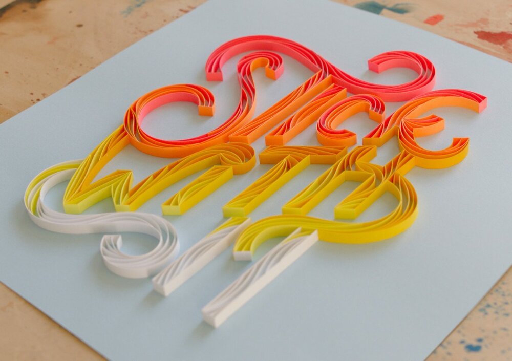 Portland’da çalışmalarını sürdüren Alia Bright, iç içe geçmiş parlak degrade desenli metinler tasarlıyor. Harfleri süslerken, kağıtları ince şeritler halinde kesip kıvırarak uygulanan kağıt telkari tekniğinden faydalandığını görüyoruz. Bright’a göre iyi bir kağıt metin yaratmanın püf noktası; kağıdın üç boyutlu görünümünün yazıyı vurguladığı veya bunun tersinin olduğu tatlı noktayı yakalamak. Bunu başardığında, çok fazla kısıtlama gerektiren bir parçada gerçekten başarılı olduğunu hissediyor. Renk, desen ve gölgelerle ilgi çekici bir görselliğin peşine düşerken diğer yandan da estetik açıdan olması gereken sadeliği korumaya çalışıyor.