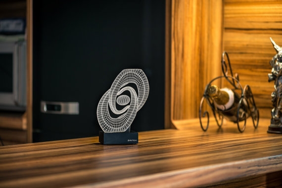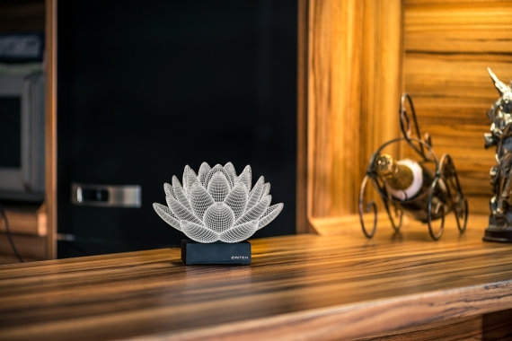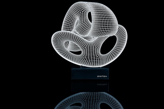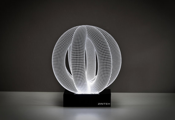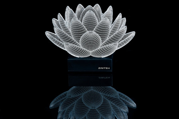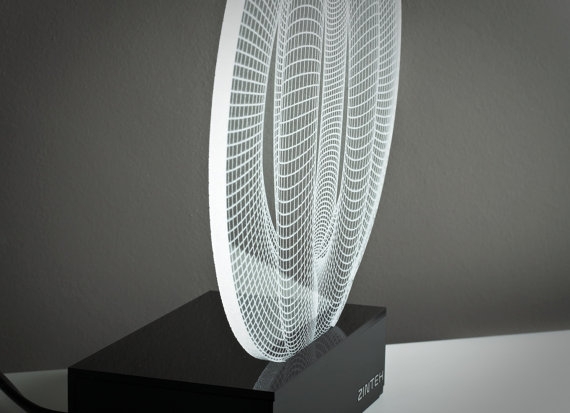 Bulgar tasarım stüdyosu Zinteh’in 2 boyutlu yassı lambalarının ışığını yaktığınızda optik illüzyonla 3 boyutlu bir forma kavuşuyor. Lazerle işlenmiş konturları ve ağ-kafes çizgilerinin organizasyonu ile göz yanılması yaratan lambaların birçok farklı modeli var; geometrik şekiller ve daha kıvrımlı formların yanı sıra el, çiçek, zar gibi formlarda olanları da var.