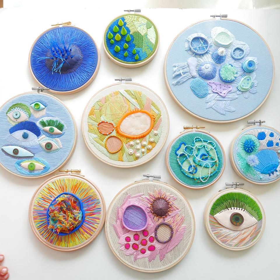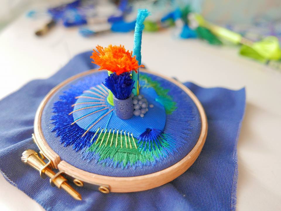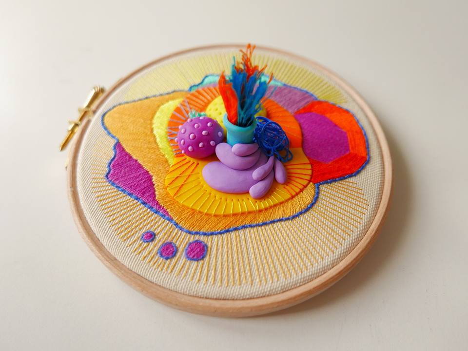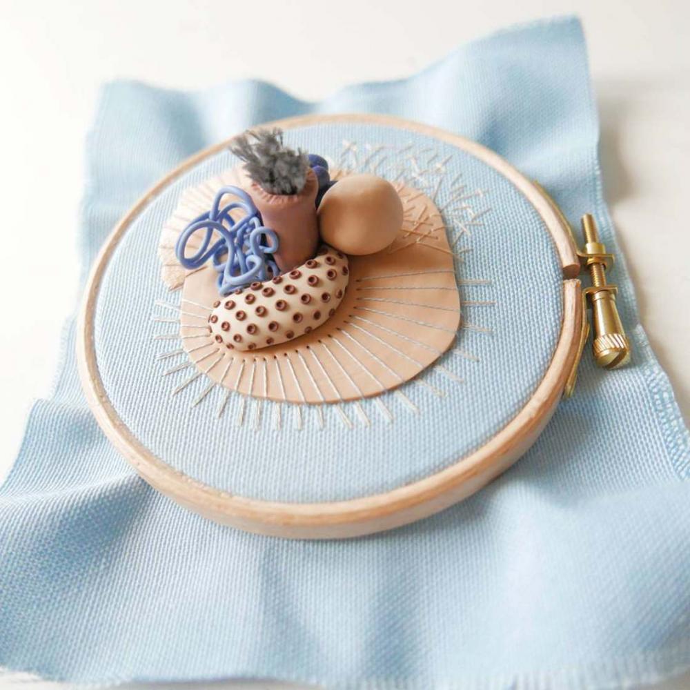 Justyna Wolodkiewicz nakış çalışmalarını polimer ve kil malzemelerle tamamlamış. Narin ve renkli çalışmalar, soyut geometrik formlarla tuval gibi kullanılan nakış kasnağının dışına taşıyor.