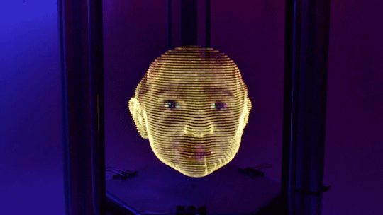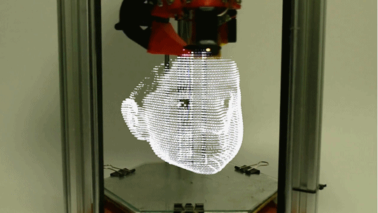Bu ilişkiyi fark eden Kalsi de 3B yazıcının ağzına RGB (Kırmızı, yeşil, mavi) ışıklar veren LED bağlıyor. Modellediği bir formu, yazıcıya gönderip baskıya başladığında ise yazıcı sarf malzemesi yerine ışık kullanıyor. Bu süreci kamerayla uzun pozladığında ise 3 boyutlu yazıcıdan, ışıkla boyanmış bir çıktı elde ediyor.