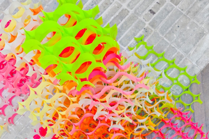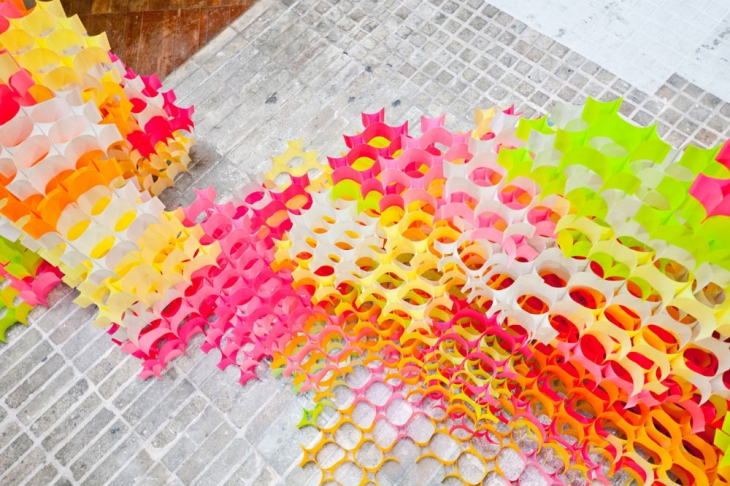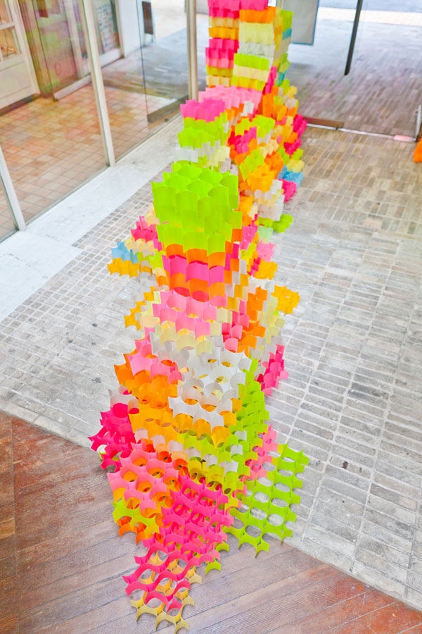 Fosforlu renklerin hakim olduğu “Sticky Note Structures” isimli yerleştirme, Kyoto’daki Artzone Galerisinde sergilenmiş ve aynı zamanda galeride sergilenen Katetsu’nun kaligrafi sergisine fon olmuş.