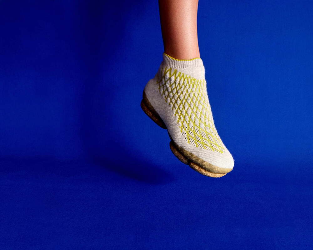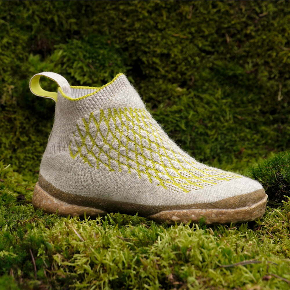 Ayakkabının bağcıkları yok. Büyük ölçüde, Berlin’de bulunan start-up Modus Intarsia tarafından köpek sahiplenenlerden kitle kaynaklı olarak toplanan köpek tüylerinden yapılmış tek parça bir dikişsiz çoraptan oluşuyor. Bu köpek tüyleri, ısıyı tutmada koyun yününden yüzde 42 daha iyi olan ve tarihsel olarak Amerika’nın Batı Kıyısındaki yerli toplumlar tarafından kullanılan yüksek kaliteli bir iplik olan Chiengora’ya dönüştürülüyor.