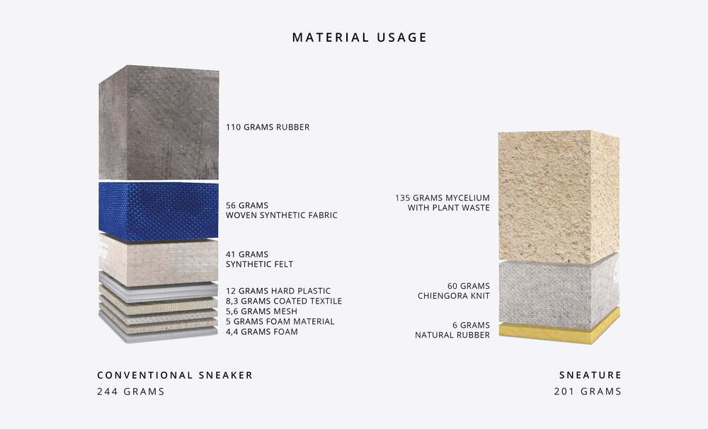 Çorap ayakkabı Sneature, mantar miselyumundan yapılmış bir tabana ve ev köpeklerinin taranırken dökülen tüylerinden örülmüş bir gövdeye sahip. Ayakkabı toplamda yalnızca üç biyo-bazlı, yenilenebilir malzemeden oluşuyor. Kullanım ömrünü tamamladığında parçalarına ayrılıp geri dönüştürülmesi veya endüstriyel olarak kompostlanması mümkün.