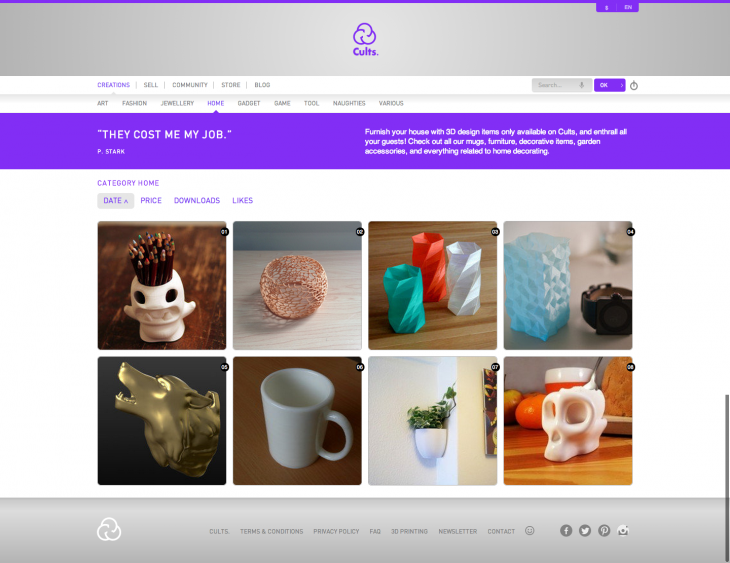 Cults, platform üzerinden gerçekleşen satışlar için %20 komisyon alıyor. Özgün tasarımcıları 3B yazıcılarla buluşturan bir platform için makul sayılabilecek bir komisyon bu. Sitede şarap mantarı hayvanları gibi ilginç seriler ve ücretsiz olarak indirilebilen kurukafa gibi popüler tasarımlar da bulunuyor.