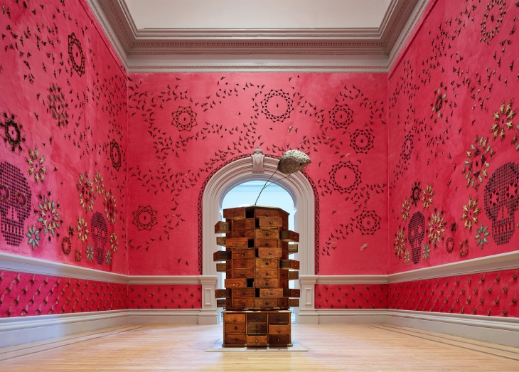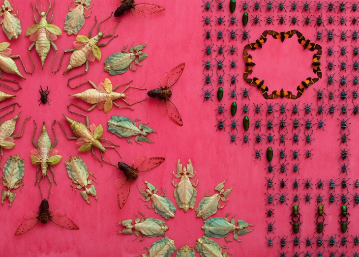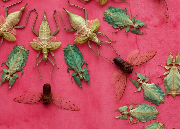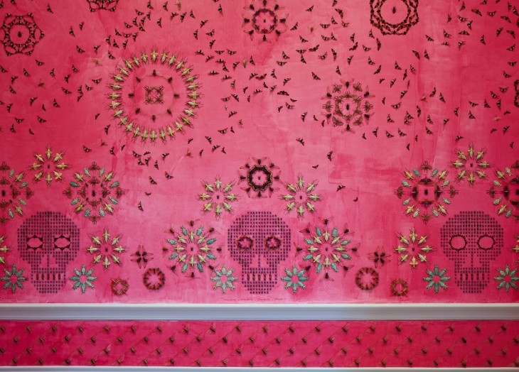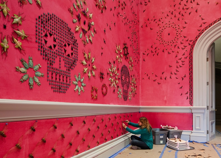 Jennifer Angus, Smithsonian American Art Museum’daki Renwick Gallery’de sergilediği yerleştirmesi “The Midnight Garden” (Gece Yarısı Bahçesi) için odanın tamamını duvar kağıdı kaplarcasına 5.000 egzotik böcekle donatmış.