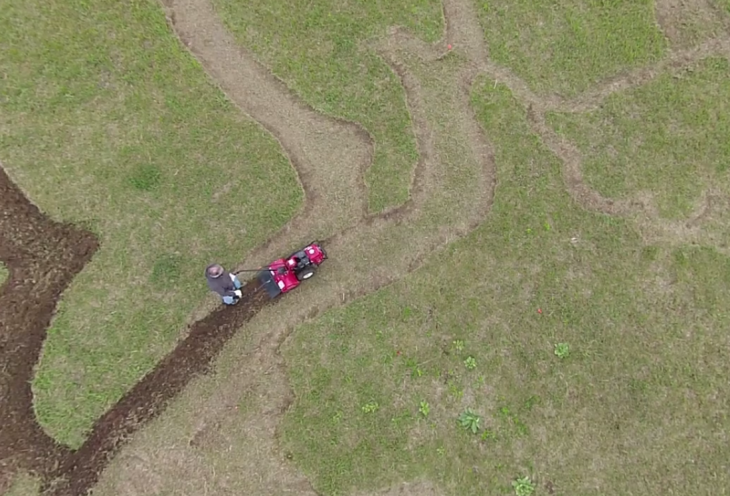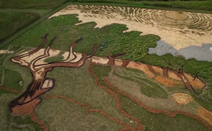 Herd, tablonun yapım aşamasında araziye yulaf, kabak, su kabağı, kavun gibi meyve ve bitkiler dikmiş. Sanatçı; çerçeve için pulluk, gölgelendirmeler için sabanını kullanmış.