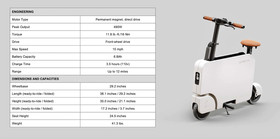 Motocompacto katlanmış durumdayken, yalnızca 74 cm uzunluğunda ve 54 cm yüksekliğinde olan tekerlekli bir çanta görünümüne bürünüyor. 21. yüzyılda şehir içi kullanıcıları hedef alan bu neşeli araç tıpkı selefi gibi hafif bir gövdeye sahip. Bisikletlerle yaklaşık olarak aynı sınıfta sayılan Motocompacto 19 kg. Bu boyut ve hafiflik faktörü, 3,5 saatlik tek şarjla 19 kilometrelik menzil gibi bir parça sınırlı olanaklarla birlikte geliyor. Şarj cihazı herhangi bir ev prizine takılabiliyor. Bu noktada Motocompo’nun, otomobil bagajında taşınıp yalnızca kısa yolculuklar için kullanma fikriyle doğmuş bir araç olduğunu belirtmekte de fayda var.