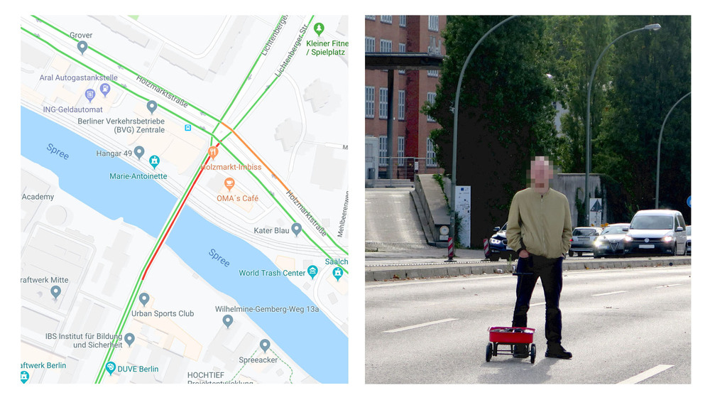 Simon Weckert, bu fikrini hayata geçirmek için arkadaşlarının telefonlarını ödünç aldı ve kiralama şirketlerinden telefon kiraladı. Tamamını kırmızı bir oyuncak vagona koyan sanatçı için artık eyleme geçebilirdi. Tüm cihazların konum servislerini ve navigasyonunu açarak yola düşen sanatçı ilk başta istediğini bulamamış. Trafik sıkışıklığının Google Maps’e yansıması yaklaşık bir saat sürmüş. Fakat sonrasında o nereye giderse harita üzerinde sıkışıklığı da beraberinde götürmüş.