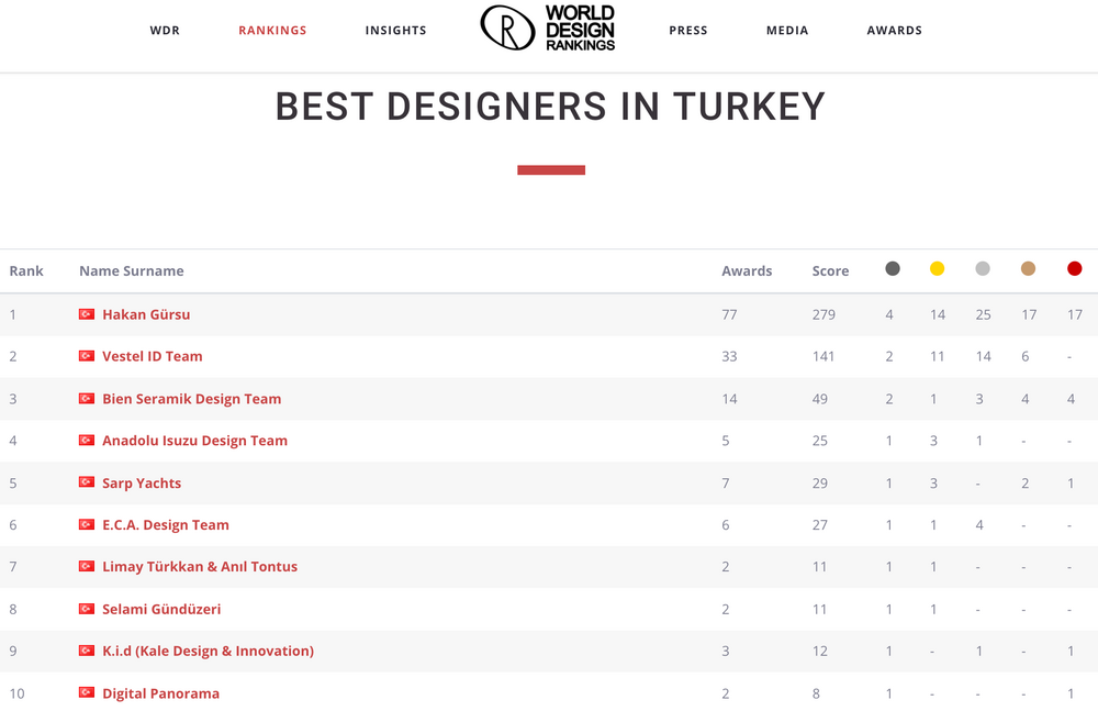 Listedeki ülkelerin isimlerine tıkladığınızda o ülkedeki en iyi tasarımcılar başlığı altında toplanmış bir alt listeyle karşılaşıyorsunuz. Örneğin Türkiye’yi tıklarsanız endüstriyel tasarımcı Hakan Gürsu’nun 1 numarada olduğu bir listeyle ve bu listede yer alan toplam 213 tasarımcının bilgileriyle karşılaşıyorsunuz. Tasarımcıların ismini tıkladığınızda da onlar hakkındaki detayları ve aldıkları A’ Design Award’ları görebiliyorsunuz.
