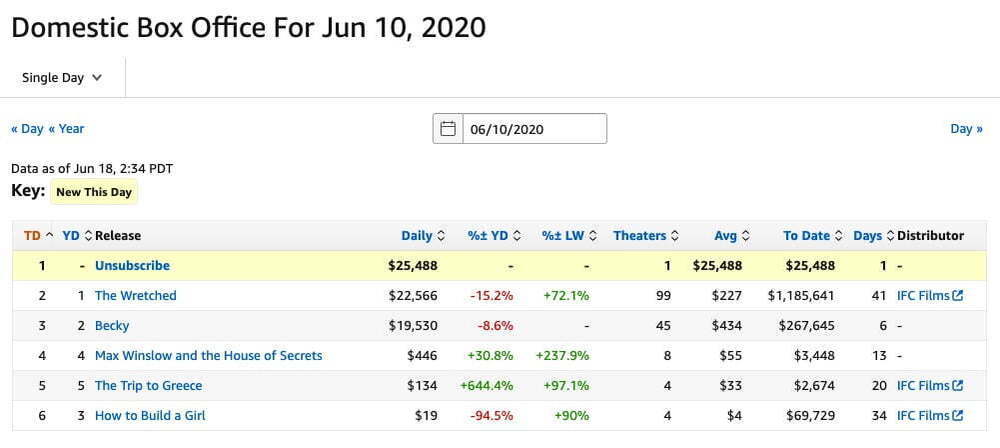 10 Haziran’da gösterime giren Unsubscribe isimli 29 dakikalık kısa korku filmi, ABD’de gişe rakamlarına göre vizyondaki filmleri sıralayan sitelerden biri olan Box Office Mojo’ya göre birinci sıraya yerleşiyor.