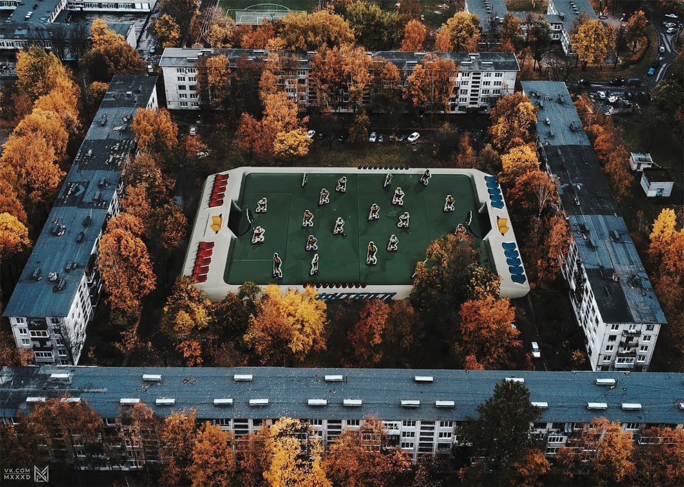 MXD; Andrei Kochergin, Eugene Zubkov, Victor Mogilat, Lev Pereulkov ve “Gentlemen of Luck” adlı 5 sanatçı tarafından ortak yürütülen dijital bir proje. Sanatçılar, Stranger Things ve Mr. Robot gibi çağdaş yapımlardan ve markalardan klasik eserlere kadar pek çok kaynaktan besleniyor. Ekip bu imgeleri Photoshop ile Rusya’nın gerçek dünya fotoğraflarına işliyor. Manzaralar karanlık ve tuhaf elbette ancak esprili bir yaklaşım da söz konusu. Yaşlı bir kadını kuş besler gibi drone’lara yem atarken ya da Mr. Robot’un Elliot’ını internet kafede otururken gördüğünüzde sahnenin absürtlüğü, karanlık yanının önüne geçiyor. Binalar üzerine yerleştirilen halı, dantel örtülü dev televizyon ve inşaat alanına dönmüş hayalet şehirler gibi bizlere de tanıdık gelecek türden imgelere de rastlamak mümkün.