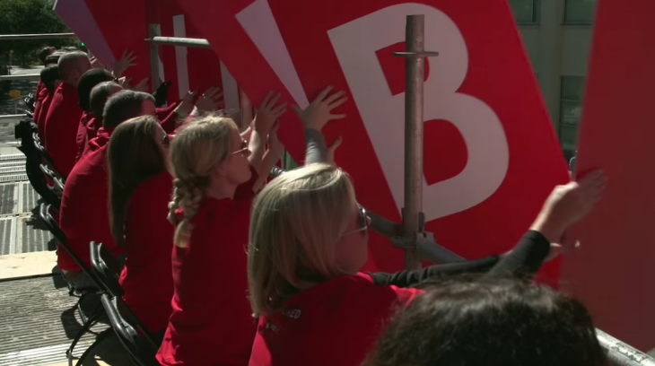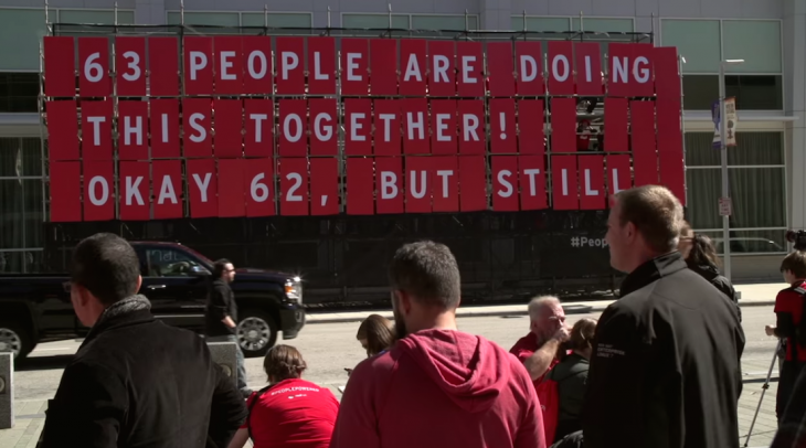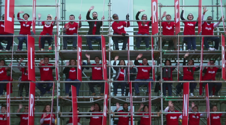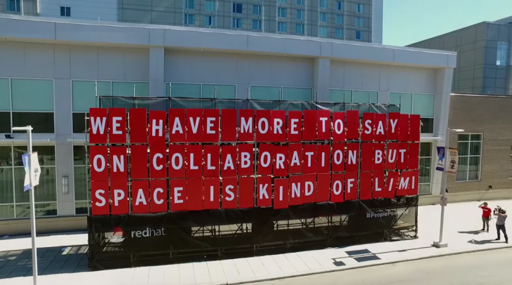 Red Hat’in Baldwin& imzalı kampanyası için hazırlanan devasa açıkhava panosunun hareketleri, pano iskeletinin içinde oturan Red Hat çalışanları ve arkadaşlarından oluşan 63 gönüllünün tribün koreografilerindeki gibi bir iş birliği içinde çalışmasıyla sağlanıyor. North Carolina, Raleigh’te gerçekleştirilen kampanyada, 63 kişilik grup, ellerindeki dövizleri kullanarak panonun üzerindeki mesajları oluşturuyorlar.