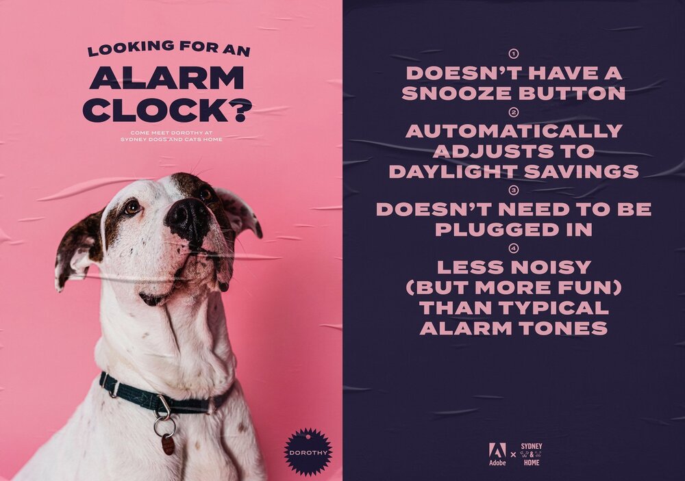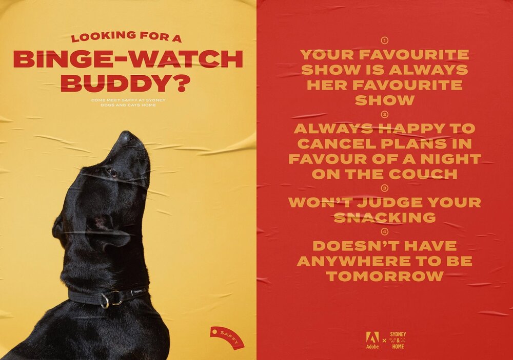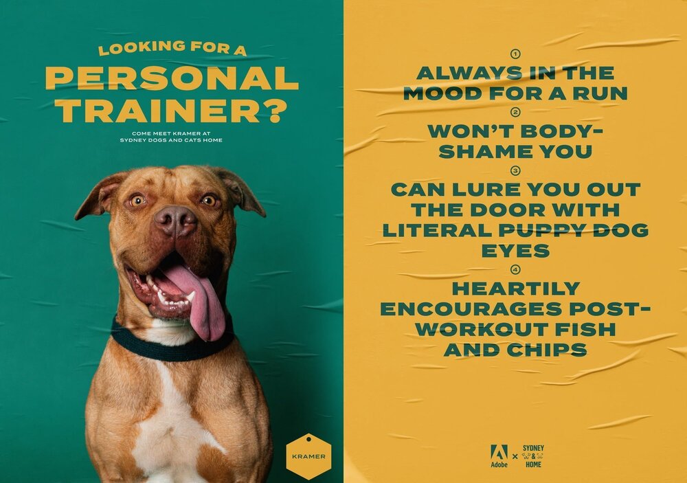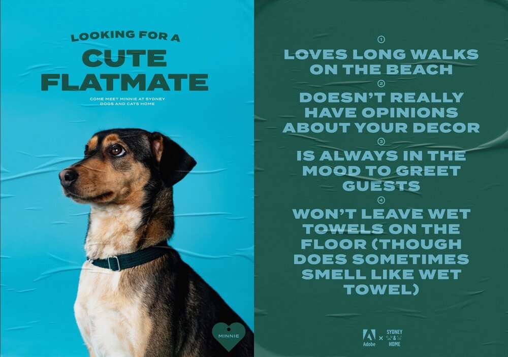 Avustralya’da yer alan hayvan barınağı Sydney Dogs & Cats Home, Adobe Pawtraits projesi için adından da anlayacağınız üzere Adobe ile iş birliği yapmış. Sydney Dogs & Cats Home, her yıl yaklaşık 3.000 kayıp, terk edilmiş ve bakıma muhtaç evcil hayvana kapılarını açıyor. Adobe topluluğundaki Avustralyalı reklamcılar, yuva arayan barınak sakinlerinin şirinliğini ve öne çıkan yeteneklerini ortaya koyan fotoğraflar ve afişler hazırlamış. Afişler sosyal medyada da kullanılmış. Sahiplendirme amaçlı kampanyaya paralel olarak bağış kampanyası da düzenlenmiş.