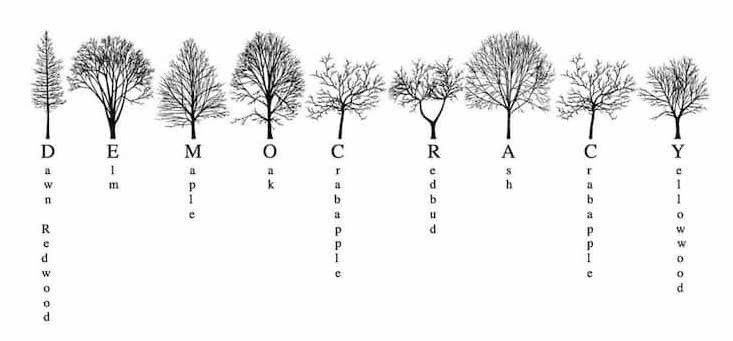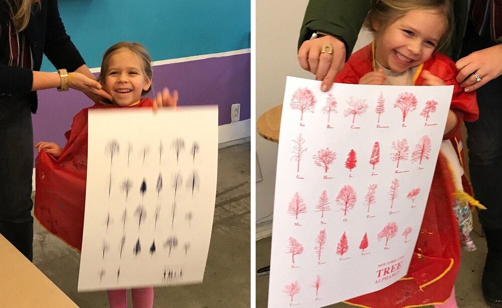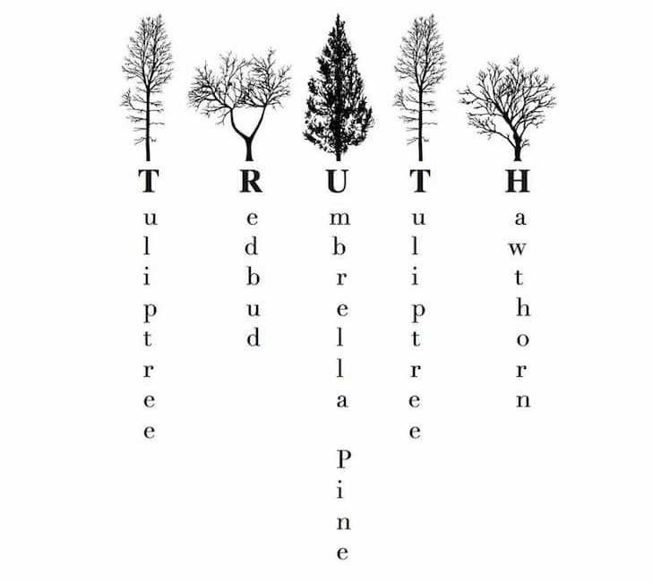 Katie Holten, New York City Tree Alphabet’i (New York Ağaç Alfabesi) yaratırken İngiliz alfabesindeki her harfe NYC’de bulunan farklı ağaçların illüstrasyonlarını atamış. Ağaç türünün baş harfi ile temsil edeceği harf örtüşecek şekilde bir sistem kurmuş. Örneğin “A” harfi “ash tree” (dişbudak ağacı) ile, “O” harfi ise “oak” (meşe ağacı) ile temsil ediliyor.