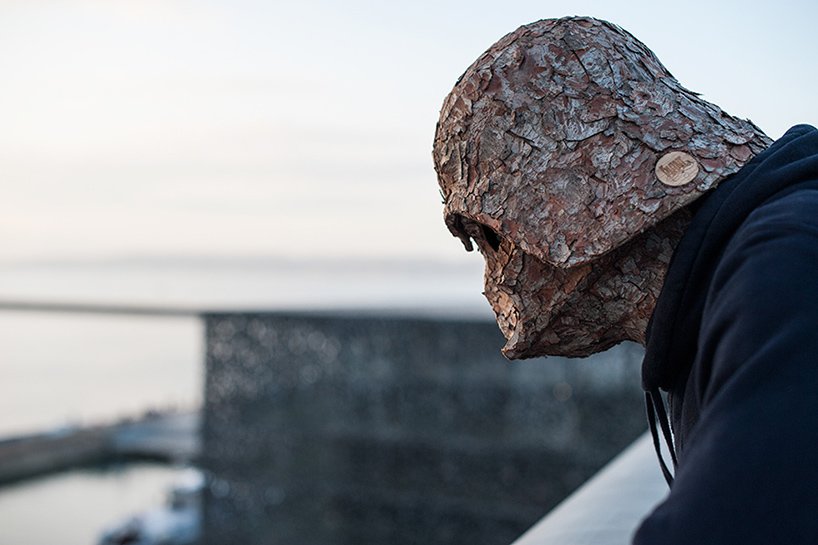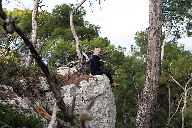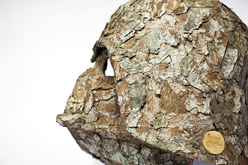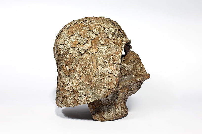 Christophe Guinet’nin ürettiği başlıklar giyilebiliyor. Gözünüzün sizi yanıltmadığına da emin olabilirsiniz, başlıkta kullanılan materyal gerçekten de ağaç kabuğu. Ağaç kabuğunu bu şekilde bir başlık formuna getirmek için büyük bir dikkat ve titiz bir çalışma gerekiyor. Christophe Guinet’nin bu kültleşmiş kültürel ikonları doğal materyallerle yeniden yaratmasının altında da tıpkı saksıya dönüşen Apple bilgisayar projesinde görülen “doğaya dikkat çekmek için ünlü olanı kullanma” amacı görülebiliyor.
