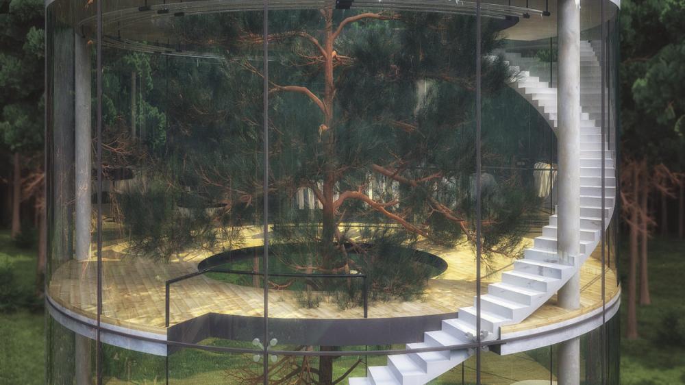 Kazak mimar Aibek Almasov, ağaç evi tam anlamıyla ters yüz etti ve tasarladığı silindir biçimindeki cam evi ağaç kesilmesine gerek kalmadan koca bir ağacın çevresine inşa ederek doğa dostu olduğu kadar son derece alışılmadık bir konsept tasarıma imza attı. Cam duvarlarla kaplı geniş bir hole sahip binanın 4 dairesel katı ve spiral şeklinde merdivenleri bulunuyor.