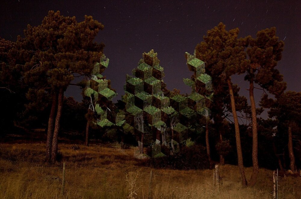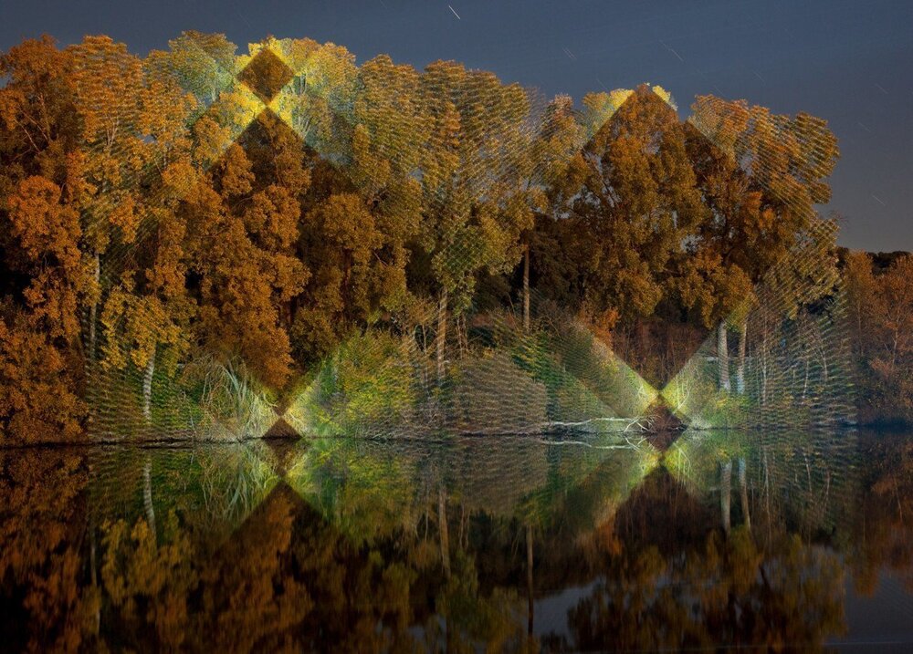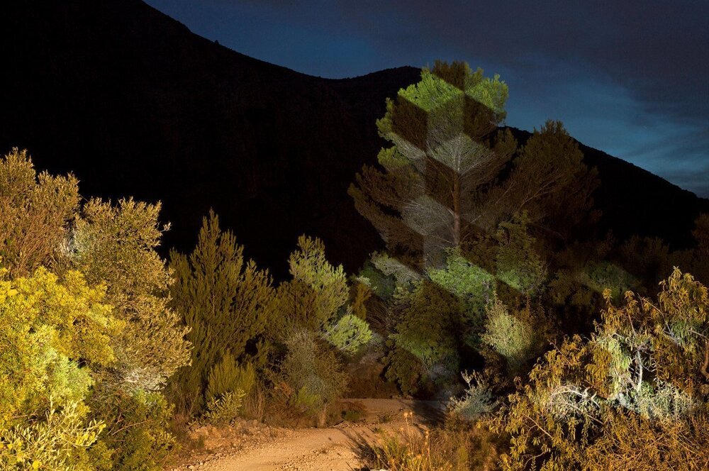Projeksiyonla yansıtma tekniği, özellikle parklarda ve doğal alanlarda uygulandığında büyüleyici sonuçlar ortaya koyuyor. Philippe Echaroux’un Central Park’ta ağaçlara projeksiyonla yansıttığı portreler, Maizz Visual’ın, yok olan hayvan türlerine dikkat çekmek için ağaçların üzerine yansıttığı hareketli hayvan portreleri ve VJ Suave tarafından ormanlara yansıtılan animasyonlar yer verdiğimiz en güzel örneklerdendi. Kendisini arazi sanatçısı olarak tanımlayan Javier Riera’nın ağaçlar ve ağaç kümeleri üzerine yansıttığı geometrik formlar da radarımıza takılan bir başka dikkat çekici sanat projesi.