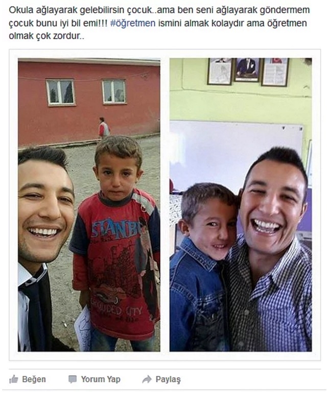 Van, Erciş’te görev yapan Öğretmen Gökhan Bulut, mesleğine, unvanına ve bunun getirisi olarak çocuklara karşı hissettiği sorumluluğu Facebook hesabından bir fotoğrafla paylaştı. Ve bu gönderi tüm doğal duygularla o kadar çok paylaşıldı ki sosyal medya üzerinde büyük bir sevgi ve takdir topladı.