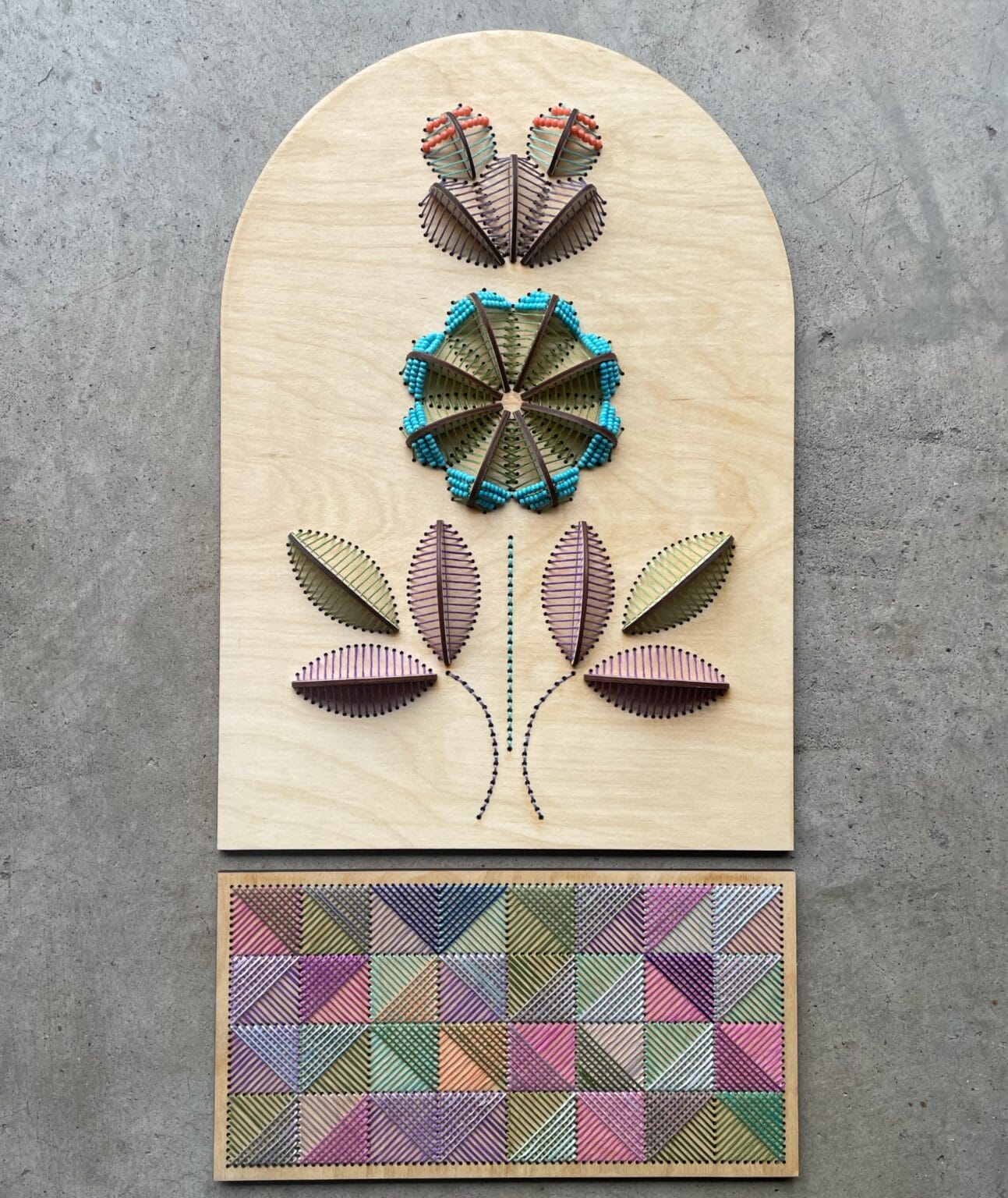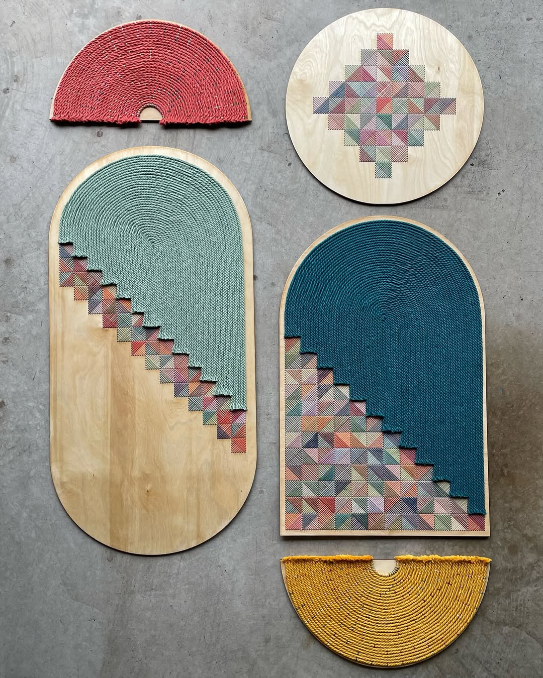 Renkli ipliklerden oluşan geometrik desenler, bir ikiliği anlatan hikayeleri taşıyor. Genellikle yuvarlak, kare ya da çiçek formundaki ahşap zeminlere oturtulan bu işler; ışık ve gölgeyle oynayarak izleyiciye yaşayan, dokunsal bir heykel deneyimi sunuyor. “İplik işlerimdeki renk çizgileri sadece süsleme değil; izleyici her bir parçanın etrafında dolaştıkça yoğunluğunu ve derinliğini ortaya çıkaran yollar,” diyen sanatçı, eserlerinin ışık, renk ve bağ kurma üzerinden değişken deneyimler sunduğunu vurguluyor.