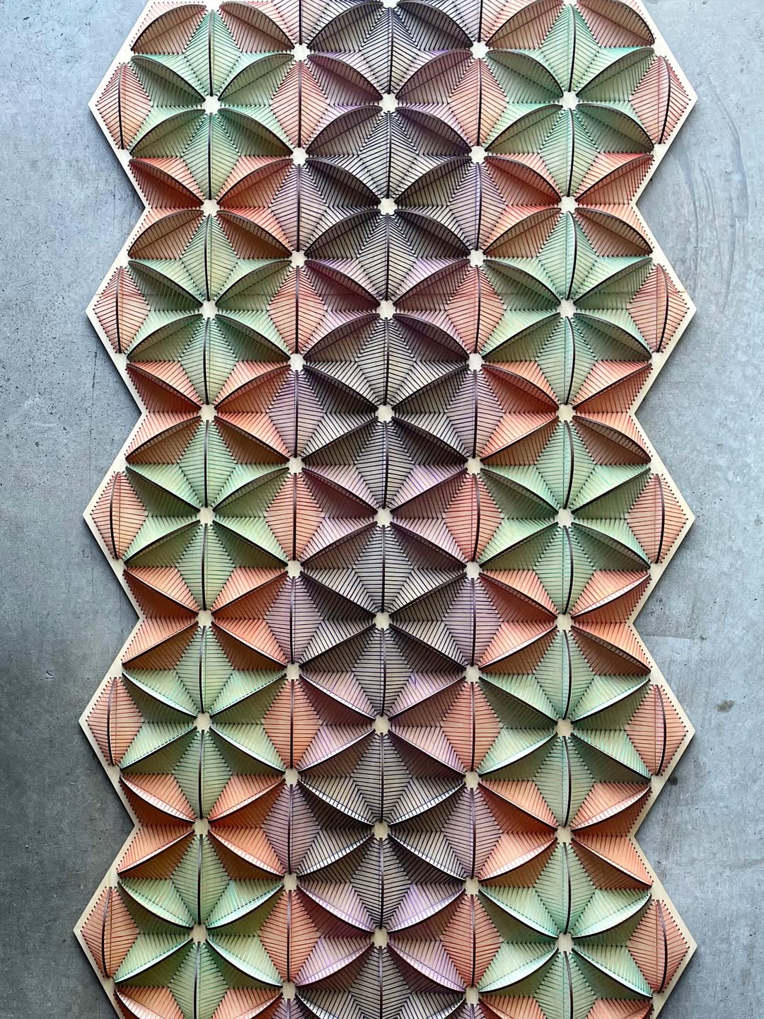 Eserleri göz kamaştırsa da Iqbal, izleyiciden sadece yüzeye bakmakla yetinmemesini istiyor. Zira bu işlerin ardında kadim ama sürekli dönüşen bir anlatı var. “Doğuda doğup Batı’da yaşamak, beni yenilik yapmaya itti,” diyen sanatçı, farklı sanat akımlarını harmanlayarak hem köklerine sadık kalan hem de yeni etkileri kucaklayan bir ifade dili geliştirdiğini söylüyor. “Ahşapla ipliğin farklı boyutlarda birleşmesiyle izleyiciyi yüzeyin ötesine bakmaya, çok katmanlı bir perspektifi düşünmeye davet ediyorum.”