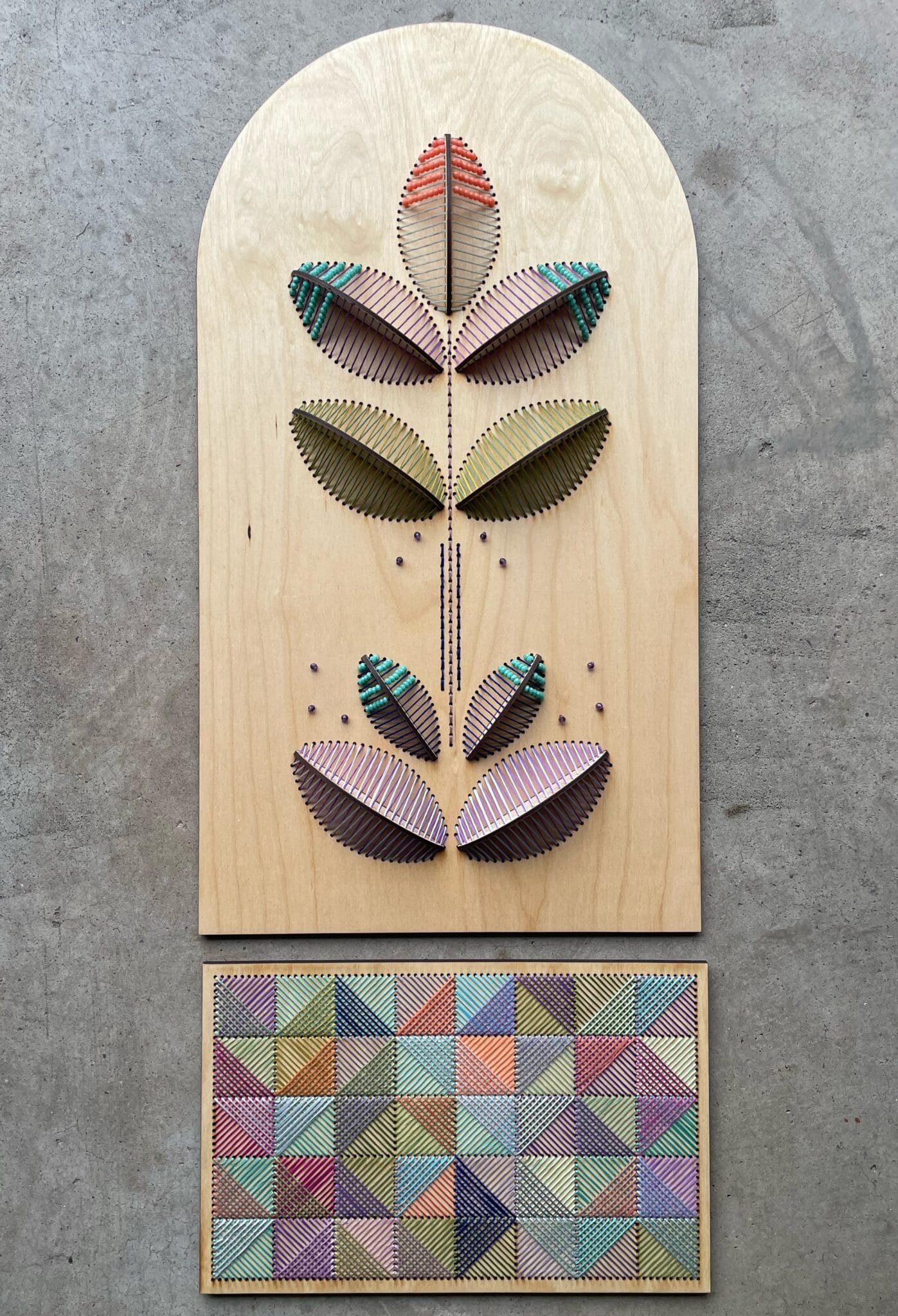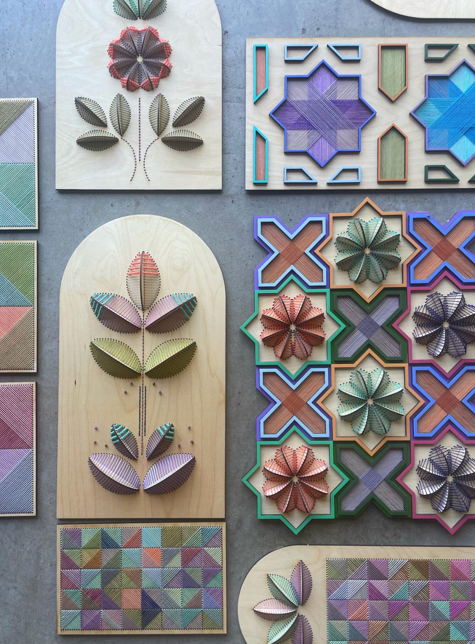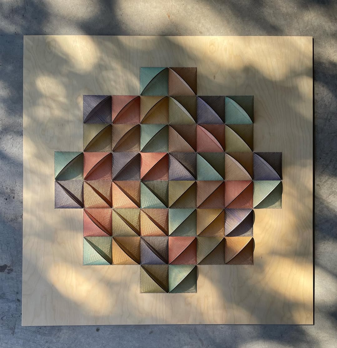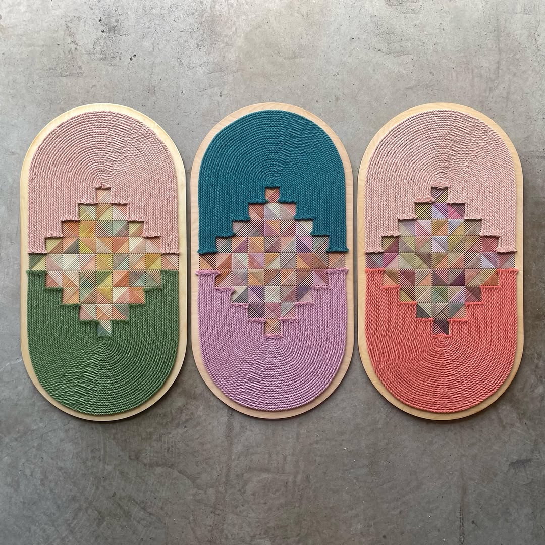 Renkli ipliklerden oluşan geometrik desenler, bir ikiliği anlatan hikayeleri taşıyor. Genellikle yuvarlak, kare ya da çiçek formundaki ahşap zeminlere oturtulan bu işler; ışık ve gölgeyle oynayarak izleyiciye yaşayan, dokunsal bir heykel deneyimi sunuyor. “İplik işlerimdeki renk çizgileri sadece süsleme değil; izleyici her bir parçanın etrafında dolaştıkça yoğunluğunu ve derinliğini ortaya çıkaran yollar,” diyen sanatçı, eserlerinin ışık, renk ve bağ kurma üzerinden değişken deneyimler sunduğunu vurguluyor.