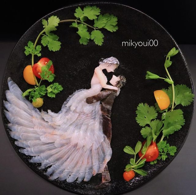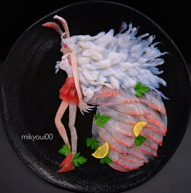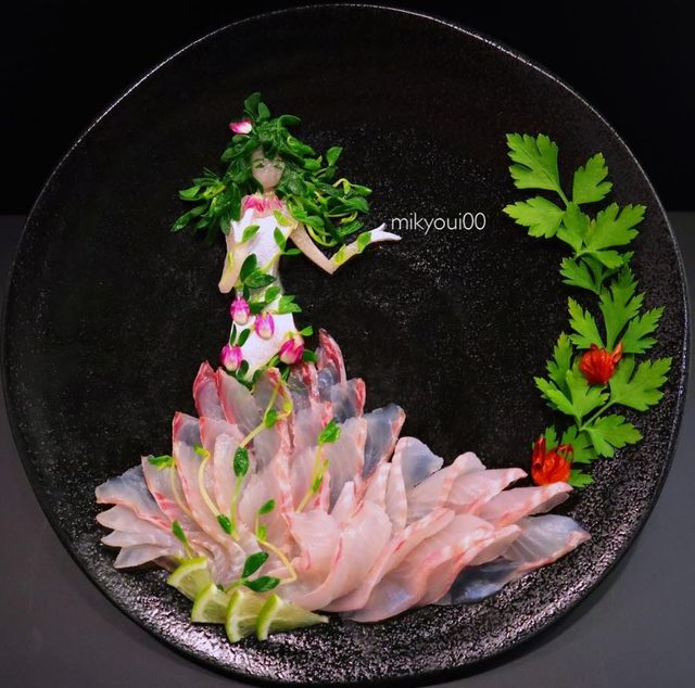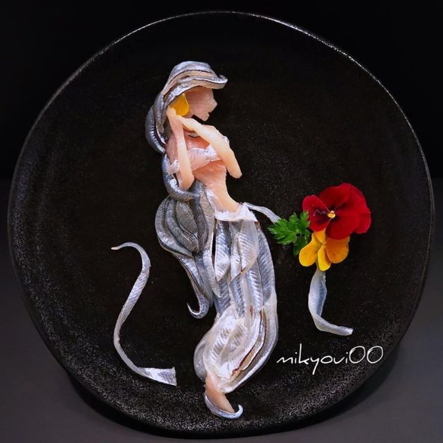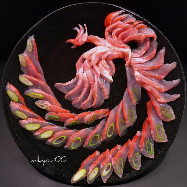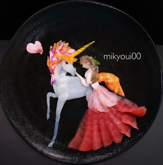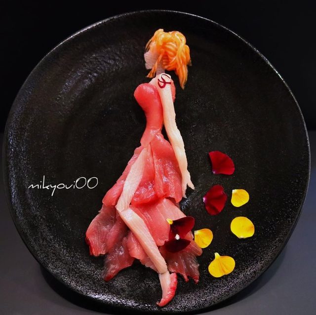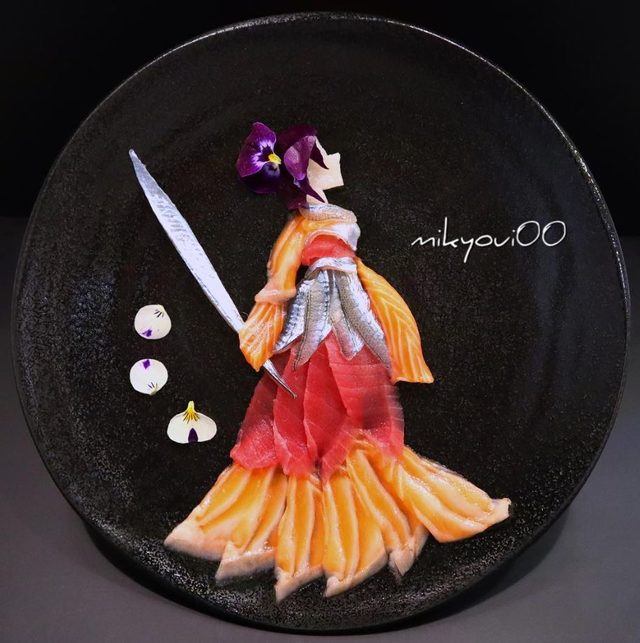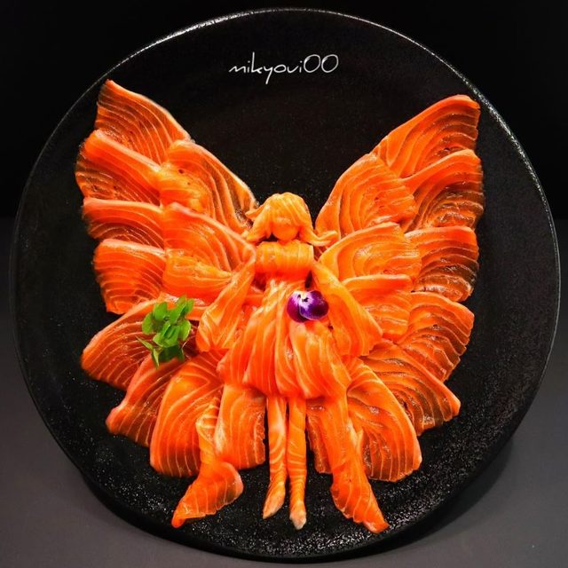 Yiyeceklerle adeta sanatsal işler ortaya çıkarılabileceğini özellikle Instagram’da fenomen haline gelen vegan yiyecek ve içecek tasarımcılarında sık sık görüyoruz. Vegan tatlılar ve kahvaltılar, ebru ve mandala karışımı desenlerle süslenmiş vegan smoothie’ler ve mandala kekler bunun en güzel örnekleriydi. Instagram’da @Mikyoui00 kullanıcı adıyla tanınan Mikyou ise saşimi tasarımlarıyla büyük bir hayran kitlesi kazanmış.