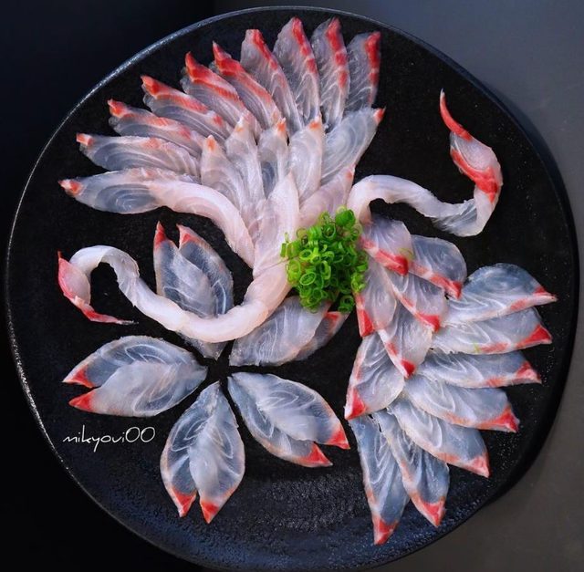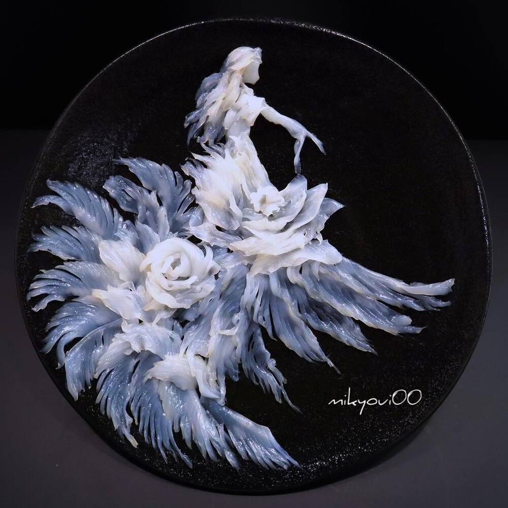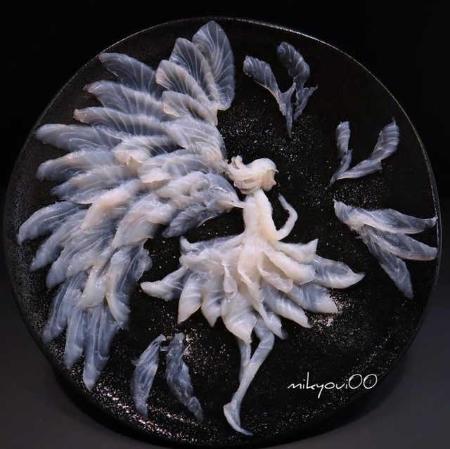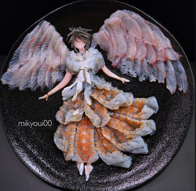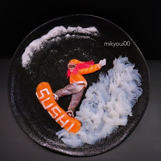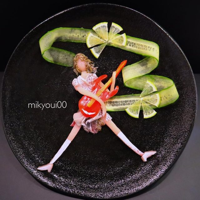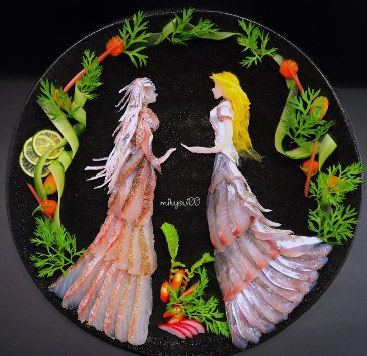 Yiyeceklerle adeta sanatsal işler ortaya çıkarılabileceğini özellikle Instagram’da fenomen haline gelen vegan yiyecek ve içecek tasarımcılarında sık sık görüyoruz. Vegan tatlılar ve kahvaltılar, ebru ve mandala karışımı desenlerle süslenmiş vegan smoothie’ler ve mandala kekler bunun en güzel örnekleriydi. Instagram’da @Mikyoui00 kullanıcı adıyla tanınan Mikyou ise saşimi tasarımlarıyla büyük bir hayran kitlesi kazanmış.