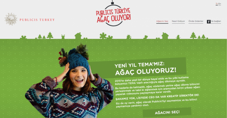 Yeni yıl konsepti dediğimizde Publicis Türkiye’nin ağaç olduğu işi de atlamamak lazım. TEMA Vakfı ile birlikte başlattıkları proje dahilinde bu yılki bütçesini ortak fidan dikmeye ayıran ajans, bunu da bir internet sitesi ile destekleyerek yılbaşı ağacı gibi süslenmiş çalışanlarını oylamaya sundu.