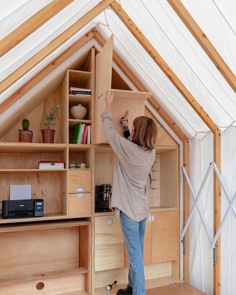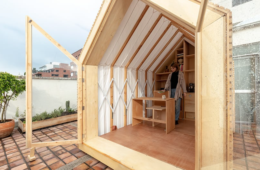 IWI, kullanıcının bireysel yaşam tarzına uyum sağlamak için sorunsuz bir şekilde kapanıp açılabilen esnek bir yaşam alanı sunuyor. Ekvadorlu mimarlar Juan Ruiz ve Amelia Tapia tarafından Quito’da tasarlanan yapıda, hafif ahşap ve kanvas kumaş kullanılmış. Yapı tam olarak kapandığında bir dolap görünümüne bürünüyor. Hatta gerçekten de dolap olarak işlev görüyor.