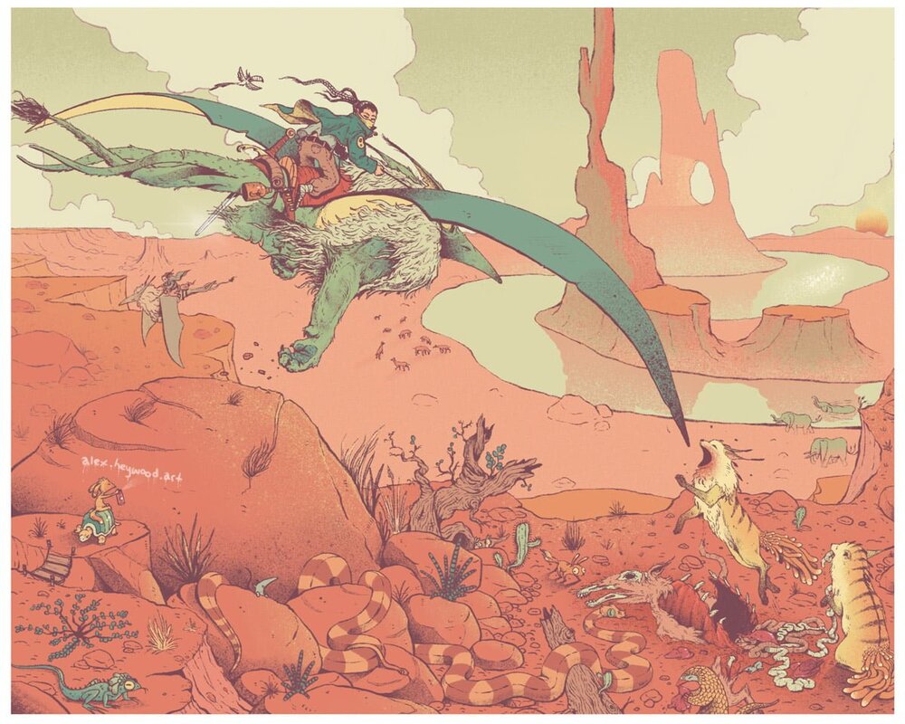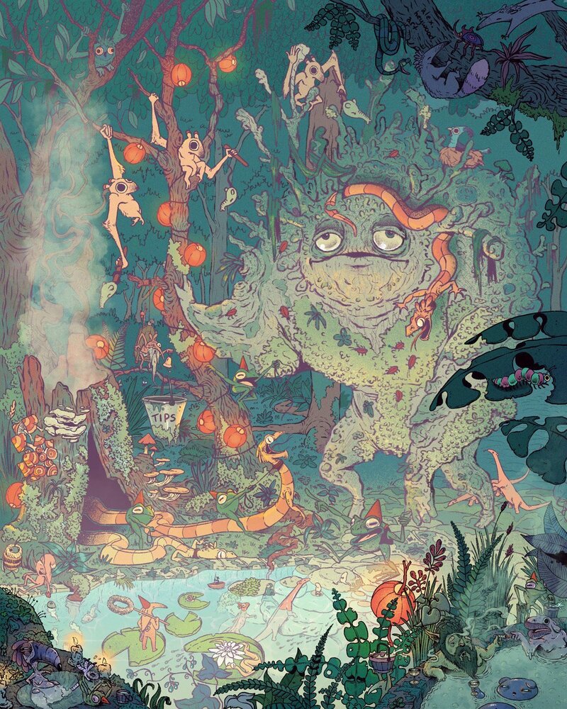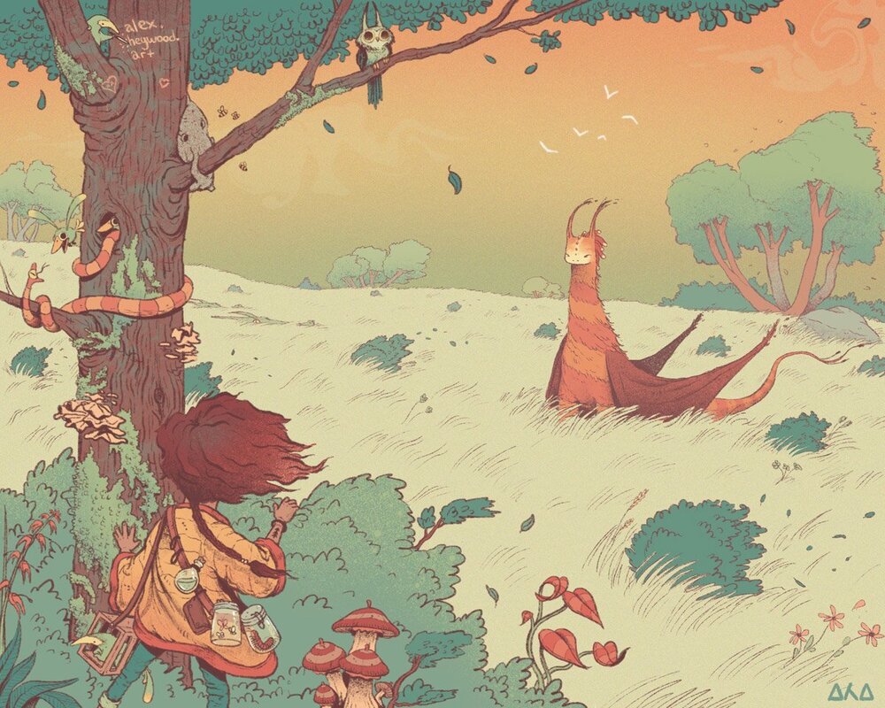 İllüstratör Alex Heywood her seferinde başka bir dünya tasvir ediyor. Bu dünyaların her birinin ayrıntılarında kendine özgü tuhaflıklar, eğlenceli yanlar ve espriler gizli. Biçimsel olarak doğadan yoğun bir şekilde ilham aldığı görülüyor. Heywood, izlediği teknik ve kullandığı araçlar konusunda pek fazla detay vermemiş ancak Instagram’da paylaştığı bir time-lapse videoda, renklendirmeyi dijital ortamda yaptığı görülüyor.