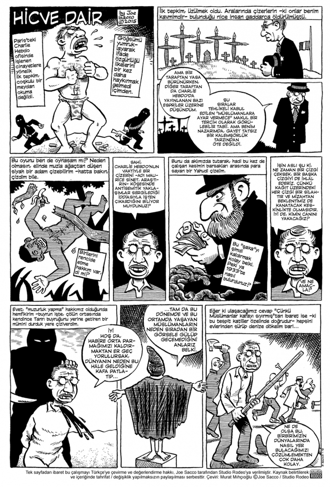Amerikalı çizgi romancı Joe Sacco, Hicve Dair eserinde olayları kendi vizyonuyla değerlendiriyor. Yaşananları normalleştirmeden, meşru kılmadan toplumları veya belirli bir meta çevresinde buluşan grupları yargılamadan önce empati kurmanın önemini vurguluyor. Dünya üzerindeki tüm insanların tek ve mutlak bir doğru çevresinde bir araya gelemeyeceğini kabul ederek herkesin anlaşabileceği daha küçük ortak doğrular üretilmeli. Ancak böyle karşılıklı anlayış yolunda adım atılabilir.