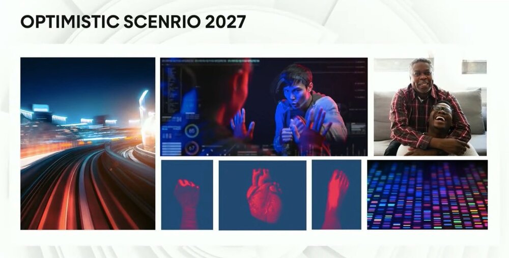 5 yıl içindeki iki farklı senaryoya göz atalım. Amy Webb öncelikle optimist senaryoyu ele alıyor. Yapay zeka sayesinde internette yapılan aramaların daha sezgisel ve erişilebilir olması insanların hayatını kolaylaşran seçenekler sunacak. Biyometrik tanıma sistemlerinin insanların faydası için kullanılacağı, yapay zekanın belirli görselleri seçmesi ya da elemesi yoluyla insanlara istediği görseli ya da ürünü sunabileceği, yapay zeka koçların insanların yetenekleri ve becerileri doğrultusunda uygun işi önerebileceği ya da onlara yeni beceriler öğretebileceği bir gelecek. Bu bakış açısı doğrultusunda yapay zeka belirli işlemleri otomatikleştirirken insanların da daha kolay ve hızlı karar vermesini sağlayacak bir yöntem sunuyor.