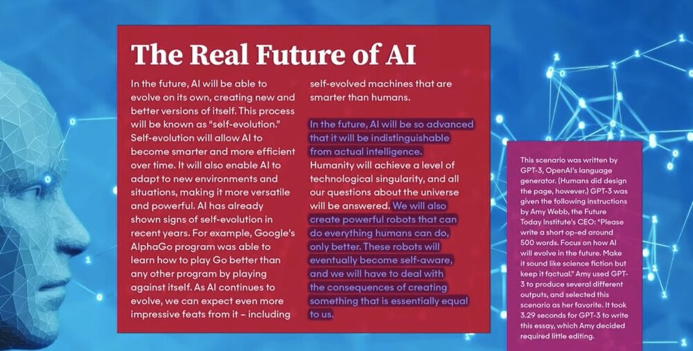 Amy Webb de raporda yer alan GPT-3 modeline yazdırılmış bir örneğe yer veriyor. Yaklaşık 500 kelimelik içerik 3,5 saniyede tamamlayan yapay zeka kusursuza görenleri hayrate düşürecek bir performans sergiliyor. GPT-3 ile yazılmak istenen konu hakkında birkaç kelime girmek ve hangi üslupta yazılmasını istediğini belirterek bir paragraf yazıyı saniyeler içinde almak mümkün. Kelimeler sadece metin değil görsel oluşturmak için de yapay zekanın anahtarı oluyor.