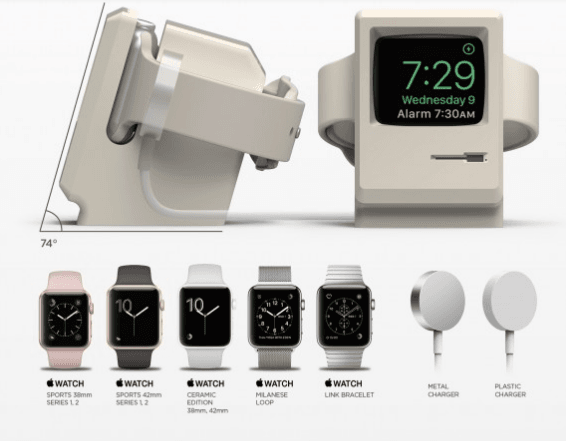 Uzun yıllardır Apple hayranı olan kitle için eğlenceli bir vintage aksesuar olacağı öngörülen stant, bütün Apple Watch modelleriyle uyumlu ve fiyatı 14 dolar. Siyah ve beyaz renk seçenekleri sunulmuş.