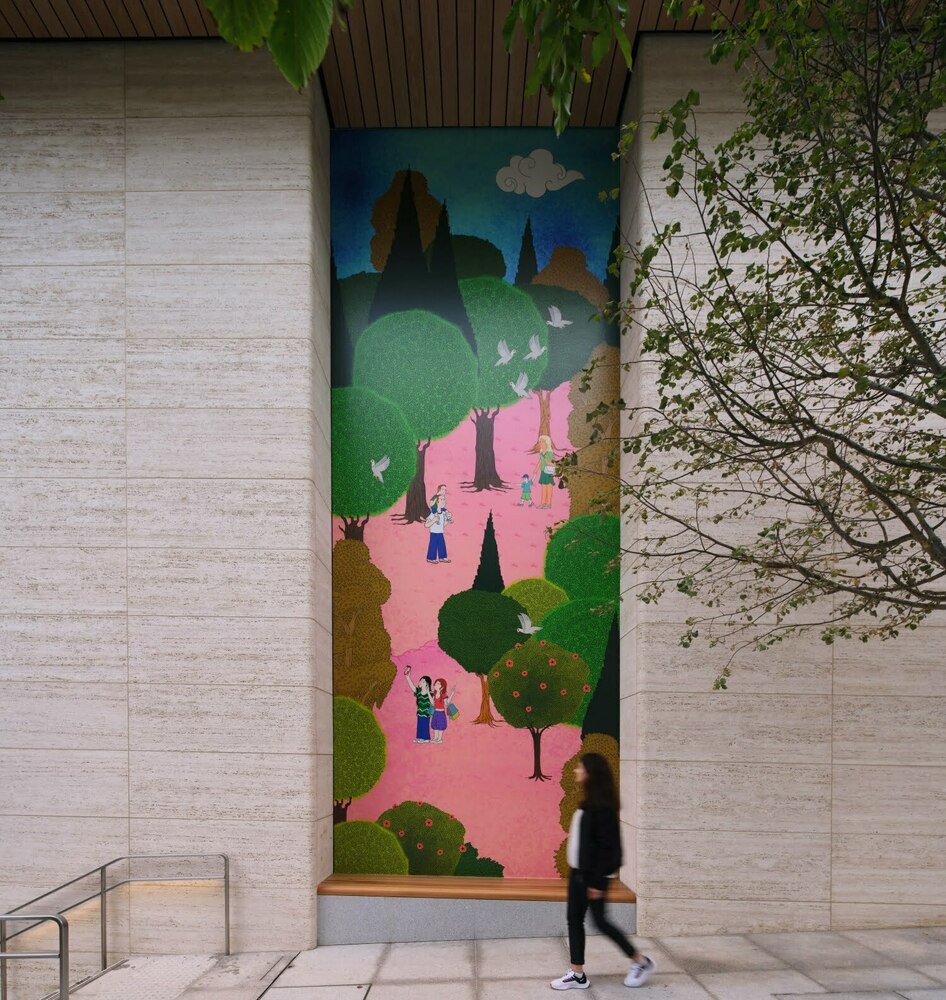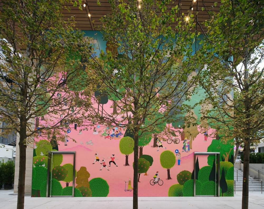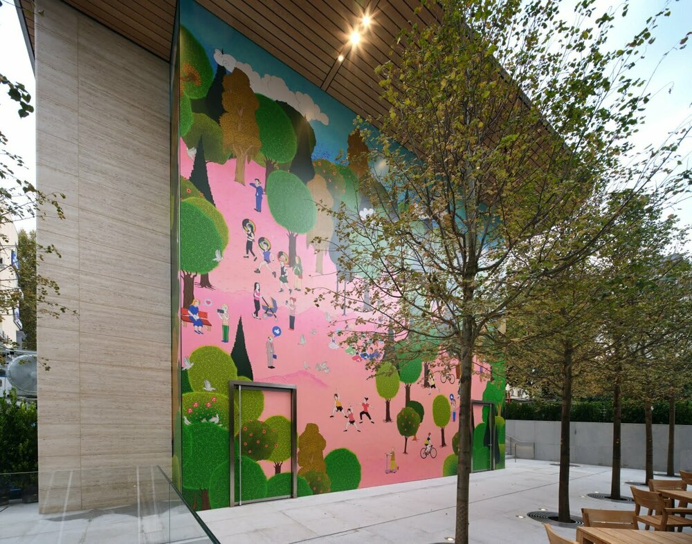 Her zaman olduğu gibi ince detayların olduğu eserde Murat Palta’nın kendine özgü minyatür figürleri ve çizgileri dikkat çekiyor. Ön cepheyi kaplayan eserin yanı sıra müstakil binanın pencereli diğer cephelerinde de eserden ufak kesitler bulunuyor. Ön cephedeki eserin ortasında Apple logosu yer alırken bu logo bulutların arasında gizlenmiş bir güneş gibi duruyor.