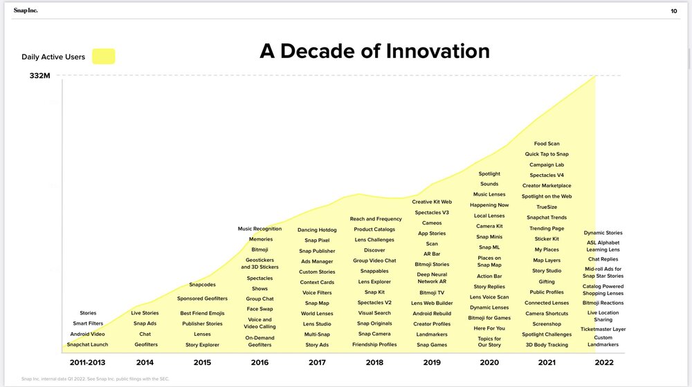 Aşağıdaki tablo, Snap’in kurulduğu yıldan bu yana ne tür yenilikler yaptığının ve bugünkü durumunun iyi bir özeti niteliğinde.