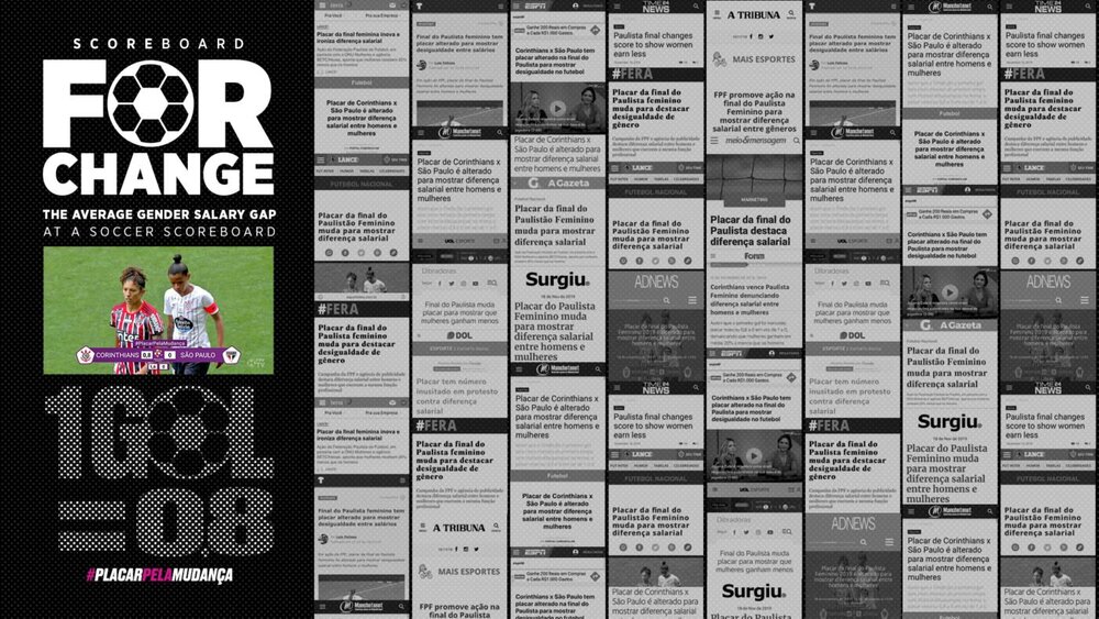 IBGE verilerine göre kadınların maaşları erkeklerden ortalama yüzde 20,5 daha düşük. Paulista Futbol Federasyonu için reklam ajansı BETC São Paulo tarafından UN Women desteğiyle hazırlanan “Scoreboard For Change” kampanyası da kadın ve erkek arasındaki bu gelir eşitsizliğine dikkat çekiyor. 16 Kasım’da oynanan “2019 Kadınlar Paulista Şampiyonası” final karşılaşmasında São Paulo’yu üç golle yenen Corinthians kupaya uzandı. Ancak FPF kanalının skor tabelasında 2,4 yazıyordu. Kampanya kapsamında bu maç özelinde her bir golün değerini 0,8 gol olarak değiştiren ajans aradaki yüzde 20’lik farka vurgu yaptı.
