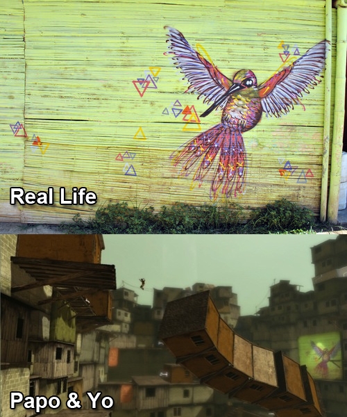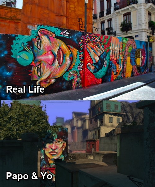 Oyunun sunduğu dünyanın ne kadar akıcı olduğunu düşünürken minik bir hareket, tüm kurguyu çok daha etkileyici hale getiriyor. O hareket de oyuncunun Papo & Yo ile çıktığı yolculuk boyunca gördüğü murallerin çoğunun Brezilya (Rio de Janerio), Şili (Valparaiso ve Santiago) gibi Latin Amerika ülkelerinde gerçekten de bulunması. Sokaklardan alınan murallara oyunda yer vermek için eser sahiplerinden izin alındığını da ekleyelim.