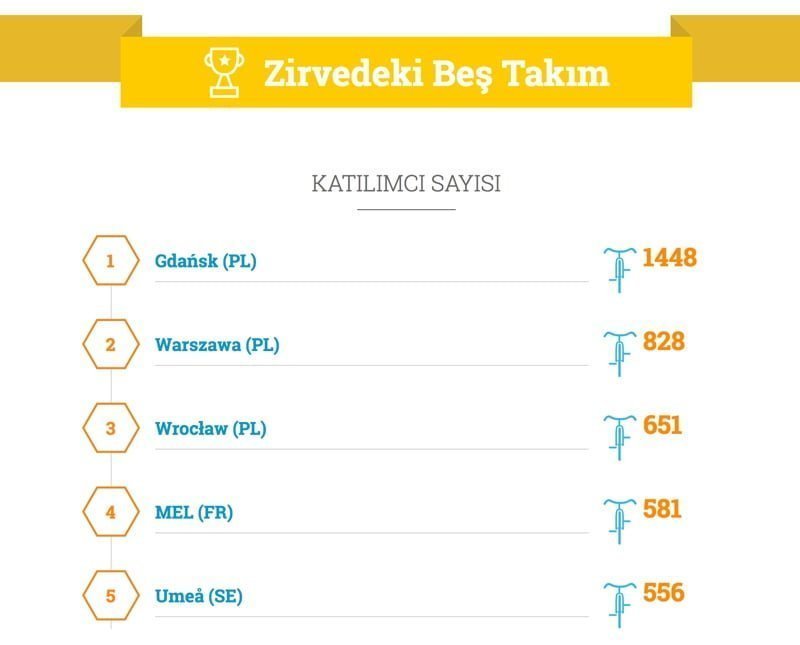 51 şehrin yer aldığı yarışmada takımların harita üzerindeki dağılımıEğer İzmir veya Mersin’de yaşıyorsanız, bu yarışmanın bir parçası olmak için akıllı telefonunuza Android, iOS ve Windows Phone işletim sistemleri için bulunan Naviki uygulaması indirerek yolculuklarınızı kayıt altına alıp şehrinize puan kazandırabilirsiniz. Avrupa Bisiklet Yarışması’na katılmanın şehre kazandırdığı artılar arasında ise, şehir sakinlerini bisiklet kullanmaya yönlendirmenin yanı sıra bisikletlerin sık kullanıladığı güzergahları verileştirme ve böylece bisiklet konusuna daha fazla yatırım yapmadan analiz etme imkanına kavuşacaklar.