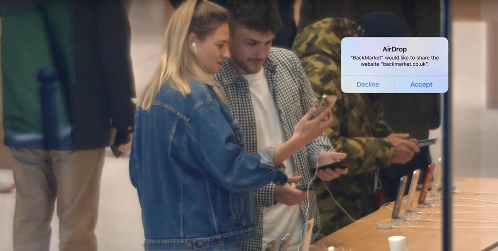 Publicis Groupe’un bir parçası olan Marcel tarafından yaratılan Hack Market kampanyası yeni bir cihaz almak üzere olanların aklını çeliyor. Potansiyel müşterileri hedef alan Back Market, Apple’ın kendi teknolojisi AirDrop’u kullanarak Apple Store’larda kendi reklamını yapıyor.