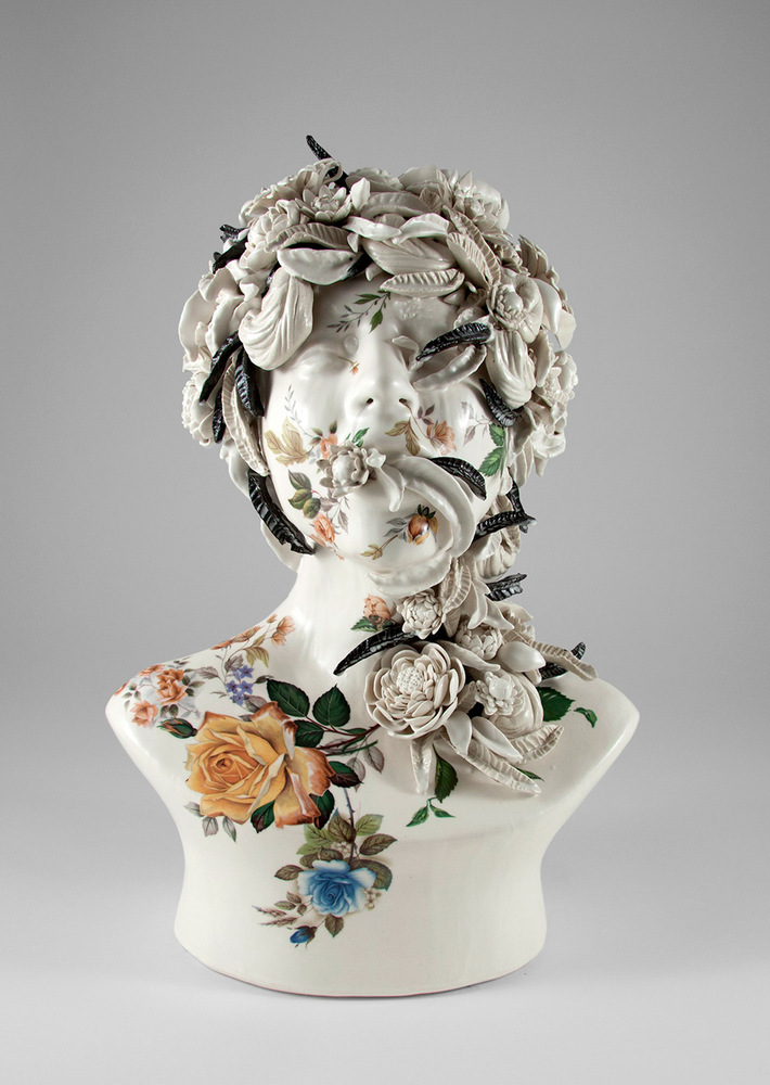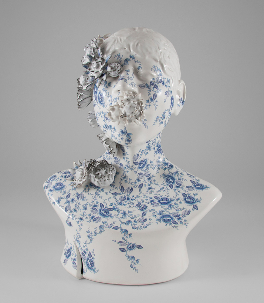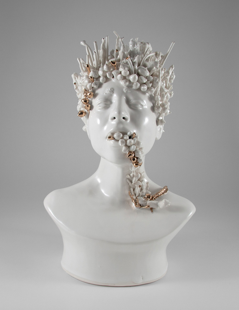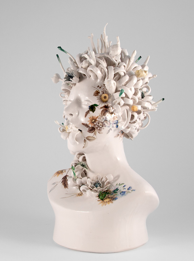 Jess Riva Cooper, önceki çalışmalarında gülümseyen ya da sessizce duran ifadelere yer veriyordu ama son projesindeki heykeller çiçek açıyor. Heykellerin ağzından, burnundan çıkan çiçekler ve derideki deliklerden fışkıran sarmaşıklar, büstlerin içinin bitki dolu olduğu hissi uyandırıyor.