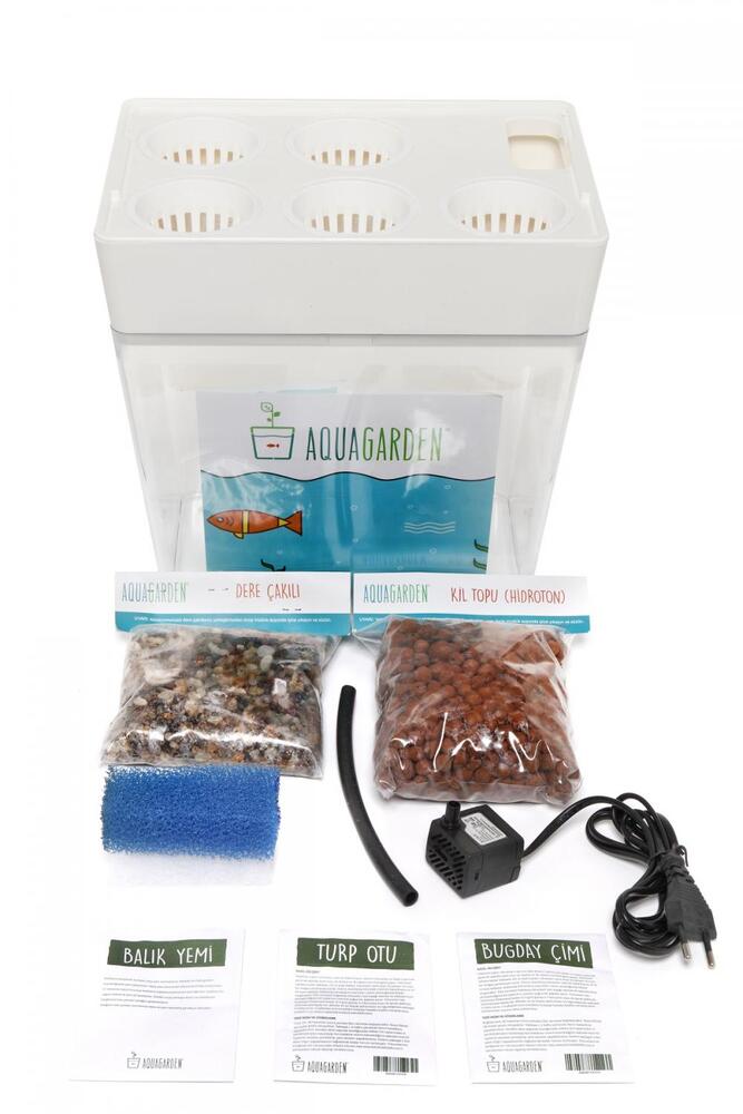 AquaGarden’da iki ana bölüm var, birinci bölüm balığın yaşadığı yaklaşık 9 litre su alabilen akvaryum bölümü, diğer bölüm ise akvaryumun üstüne yerleşirilmiş ve içerisinde 5 tane küçük saksı olan bitki yetiştirme kısmı. AquaGarden içerisinde, bu hacimde mutlu mesut yaşayabilecek miktarda balık yetiştirilebiliyor. Lepistes, Japon ya da Tetra gibi 20-22 derecede rahatlıkla yaşayan balıklar için ideal. Saksılara ise toprak yerine kullanılan, bitki köklerinin tutunabileceği hidroton denilen kil topları yerleştiriliyor ve üstlerine mevsimine göre buğday çimi, nane, fesleğen, mercimek, maydanoz, turp otu tarzında tohumlar ya da çiçek ekiliyor.